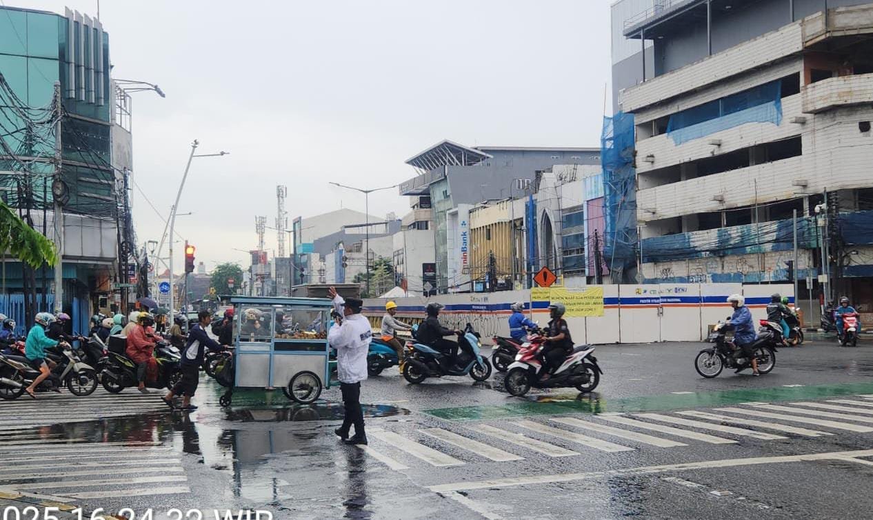 Di bawah derasnya hujan, Aipda Zaenal berdiri mengatur arus lalu lintas agar tetap tertib dan aman. Upaya ini dilakukan untuk memastikan pengendara yang melintas dapat bergerak dengan nyaman tanpa hambatan, terlebih pada jam pulang kerja yang padat mobilitas. Arus kendaraan terpantau ramai namun tetap mengalir dengan lancar.