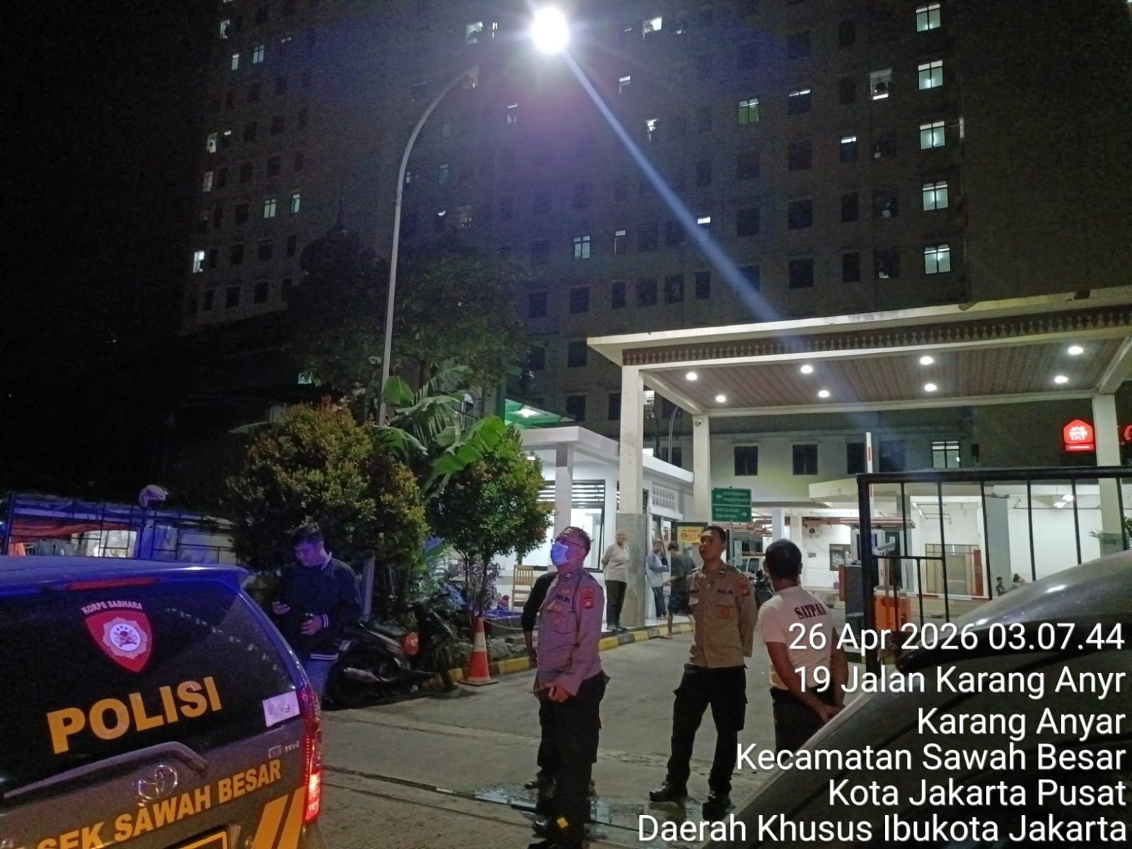 Jakarta Pusat – Personel Polsek Sawah Besar melaksanakan patroli dan penjagaan di titik rawan tawuran remaja di kawasan Rusun Karang Anyar, Kelurahan Karang Anyar, Kecamatan Sawah Besar, Jakarta Pusat, Minggu (26/4/2026) sekitar pukul 03.05 WIB. Kegiatan yang dipimpin IPDA Suja S.H selaku Panit Reskrim bersama lima anggota ini merupakan bagian dari patroli cipta kondisi (Cipkon) guna mengantisipasi gangguan kamtibmas menjelang waktu subuh. Hasil pemantauan di lapangan menunjukkan situasi aman dan kondusif.