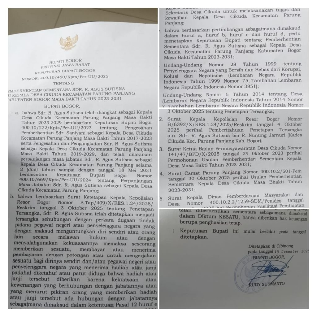 Surat Keputusan ini diterbitkan berdasarkan ketentuan peraturan perundang-undangan yang berlaku, di antaranya mengacu pada Undang-Undang Nomor 6 Tahun 2014 tentang Desa beserta perubahannya, Undang-Undang Nomor 23 Tahun 2014 tentang Pemerintahan Daerah, serta Peraturan Bupati Bogor Nomor 66 Tahun 2020 tentang Tata Cara Pemilihan, Pengangkatan dan Pemberhentian Kepala Desa. Dalam SK tersebut dijelaskan bahwa pemberhentian sementara Kepala Desa dilakukan guna menjamin kepastian hukum dan tertib administrasi penyelenggaraan pemerintahan desa, serta untuk menjaga kesinambungan pelayanan kepada masyarakat.
