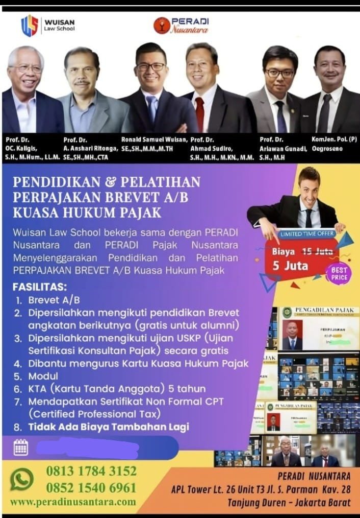 Yang hebat nya kali ini Pendidikan PKPA UPA di tambahkan dengan Pendidikan Brevet A B untuk menjadi Kuasa Hukum Pajak.