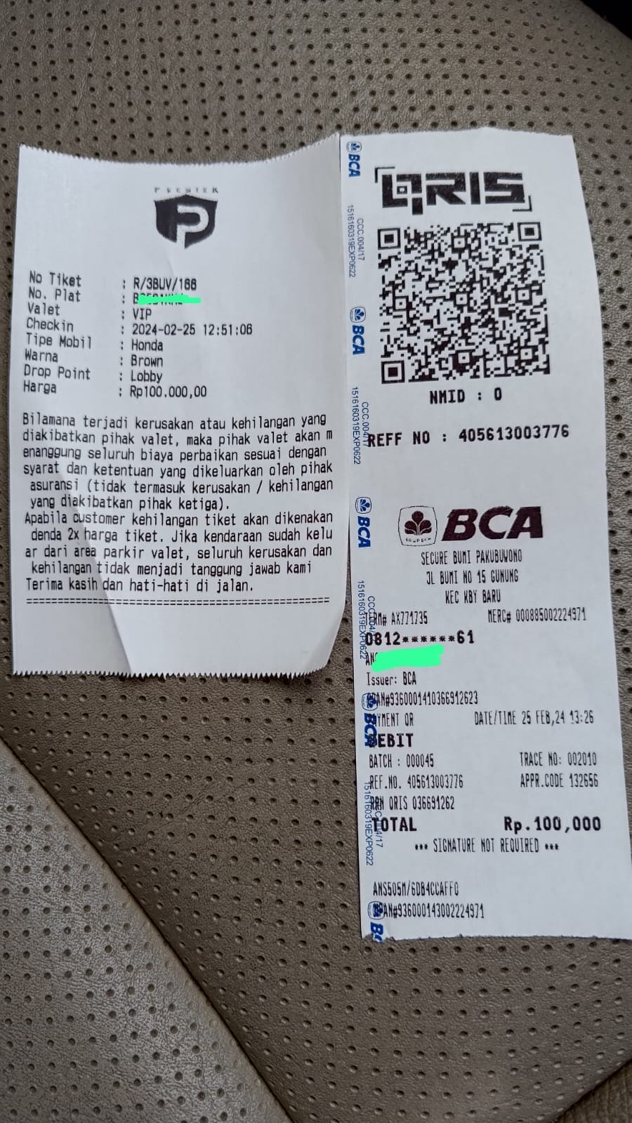 “Hari minggu saya dan keluarga berkunjung ke Bumi Pakubuwono. Dengan maksud saya menggunakan jasa parkir valet agar mempermudah saya. Tapi nyatanya saya memarkirkan kendaraan sendiri, tanpa ada petugas parkir valet. Setelah itu ada struk bayar parkir valet sebesar 100 ribu dikaca bagian depan” lanjut seorang pengunjung (26/2/24).