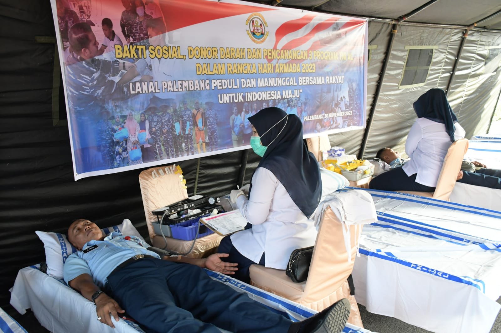 TNI AL, Palembang,- Peringati HUT Armada RI Tahun 2023, Pangkalan TNI Angkatan Laut (Lanal) Palembang gelar kegiatan Bhakti Sosial dan Donor Darah serta Pencanangan 3 Program TNI Angkatan Laut, bertempat di Lapangan Apel Mako Lanal Palembang, Kamis (30/11/2023).