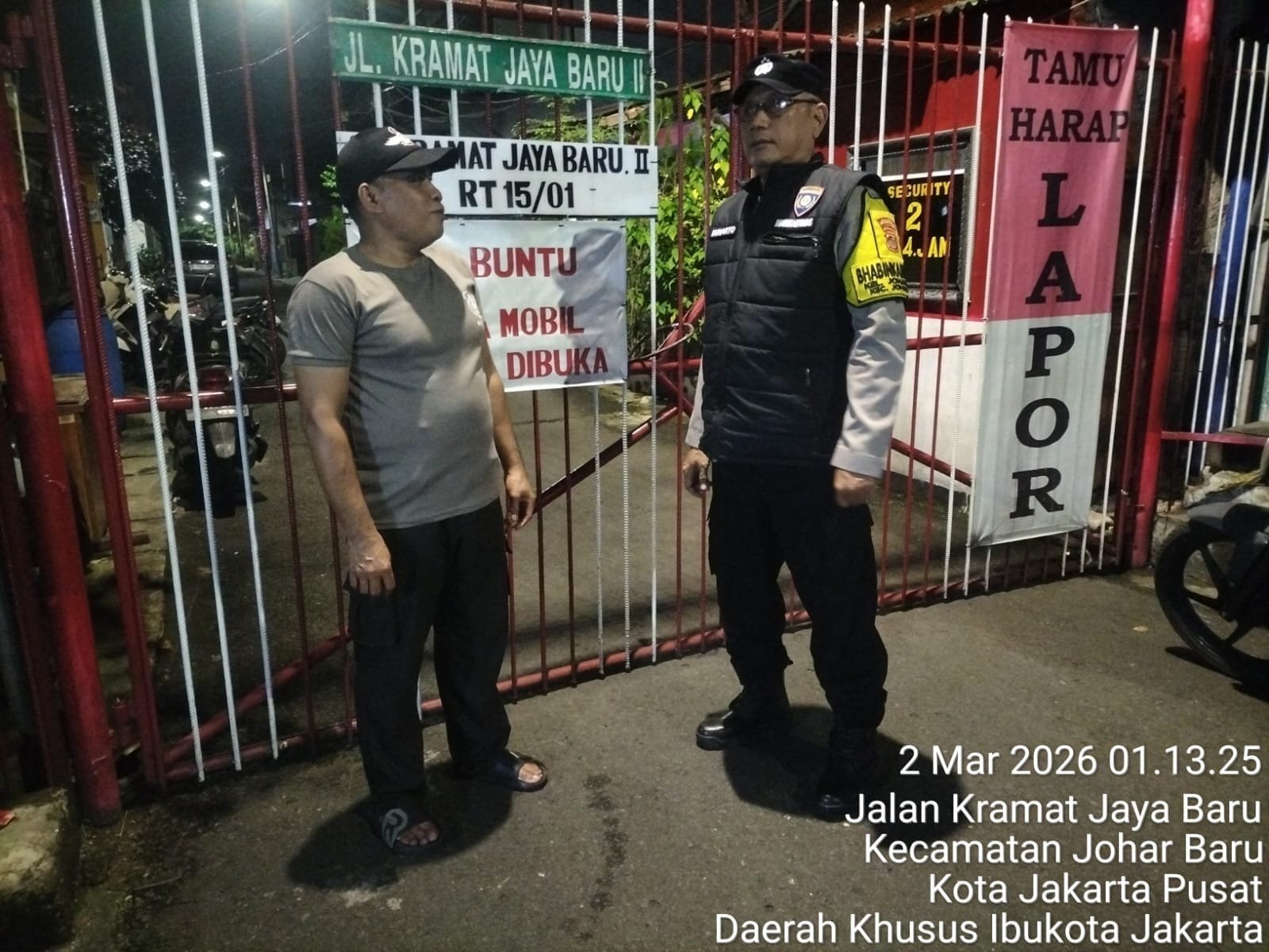 Kegiatan berlangsung di Poskamling RW 01, Jalan Kramat Jaya Baru 2 dan 3, Jakarta Pusat. Patroli dan sambang dilakukan oleh Aiptu Sunarto selaku Bhabinkamtibmas Kelurahan Johar Baru, yang bergabung bersama awak Satkamling setempat, Bapak Yudi dan Bapak Soleh.