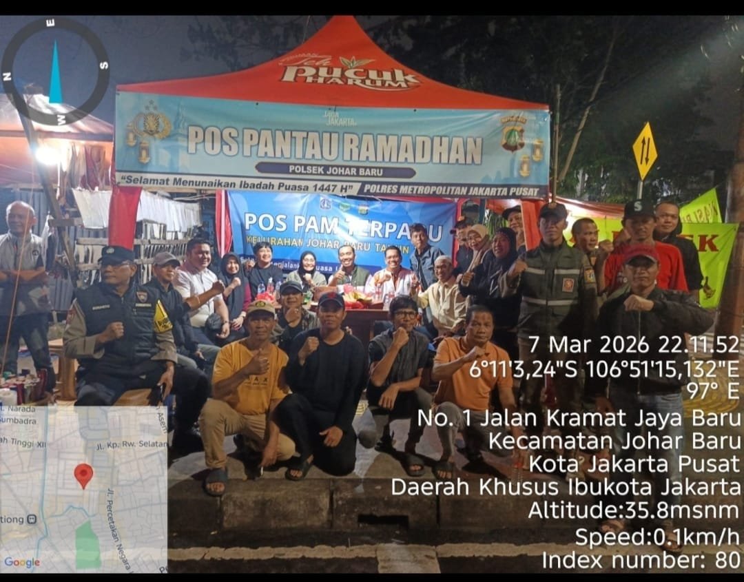 Jakarta Pusat – Dalam rangka memperkuat keamanan dan ketertiban masyarakat selama bulan suci Ramadhan 1447 H/2026, jajaran Polsek Johar Baru bersama unsur tiga pilar dan aparatur wilayah melaksanakan kegiatan Pos Pantau Ramadhan di Jalan Kramat Jaya Baru RT 13 RW 10, Kelurahan Johar Baru, Kecamatan Johar Baru, Jakarta Pusat, Sabtu (7/3/2026) pukul 22.00 WIB.