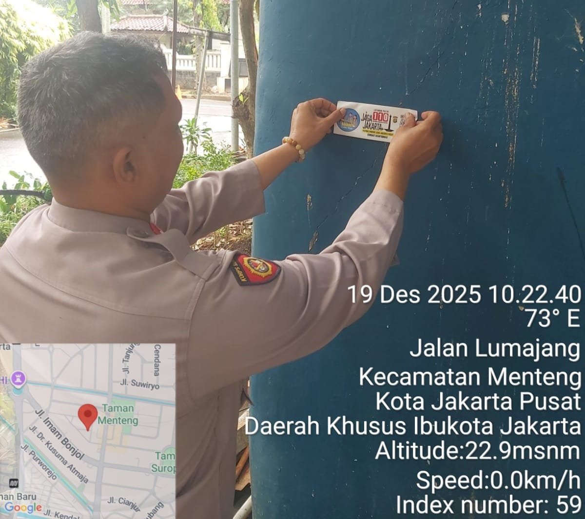 Jakarta Pusat – Dalam upaya meningkatkan pelayanan kepolisian yang cepat dan responsif kepada masyarakat, anggota Samapta Polsek Metro Menteng bersama Aipda M. Herlin melaksanakan kegiatan sosialisasi Barcode Sahabat Patroli Polisi dengan menempelkan stiker barcode di sepanjang Jalan Lumajang, Kecamatan Menteng, Jakarta Pusat. Jumat (19/12/2025)
