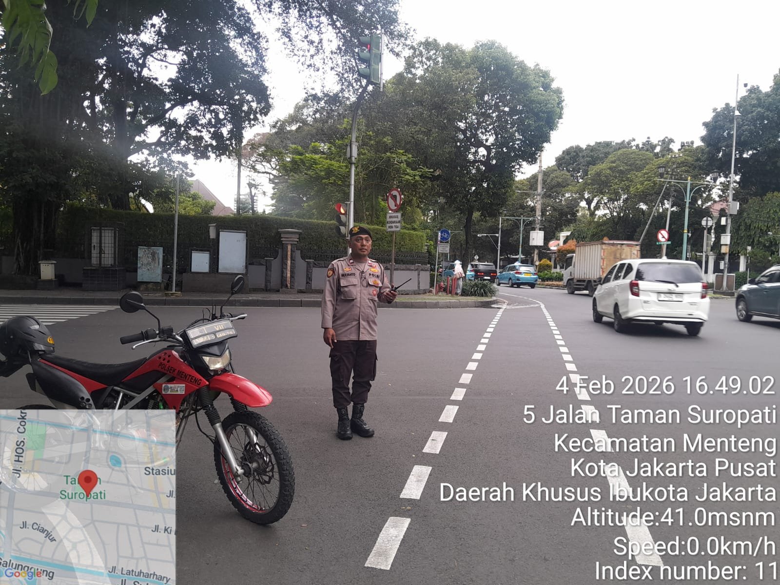 Jakarta Pusat – Guna mengantisipasi kepadatan arus lalu lintas pada jam sibuk sore hari, personel Patroli Motor (Patmor) Polsek Metro Menteng Aiptu Mulyanto melaksanakan pengaturan arus lalu lintas di persimpangan Traffic Light (TL) Taman Suropati–Jalan Diponegoro, Menteng, Jakarta Pusat. Kegiatan ini dilakukan sebagai bentuk pelayanan kepolisian kepada masyarakat, khususnya karyawan yang pulang dari kantor serta warga yang kembali ke rumah usai beraktivitas. Rabu (4/2/2026)