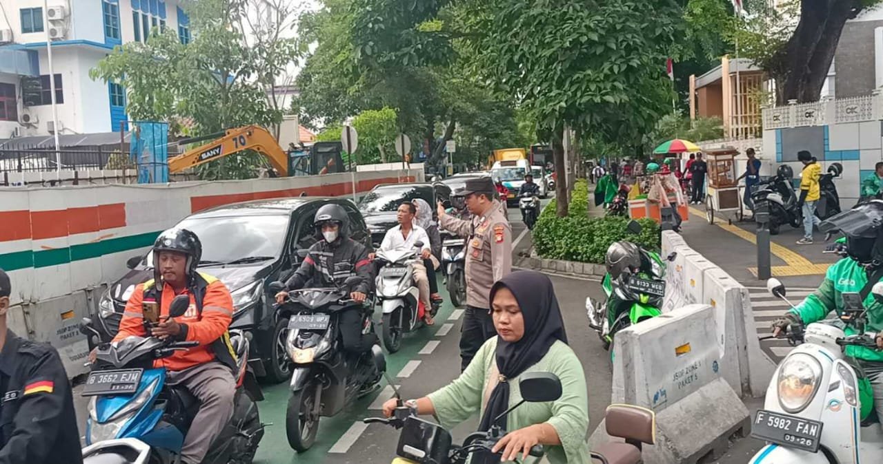 Pengerjaan proyek tersebut mengakibatkan penyempitan jalan, sehingga terjadi penumpukan kendaraan bermotor yang berpotensi menimbulkan kemacetan parah. Untuk mengantisipasi hal tersebut, kedua petugas Polsek Metro Menteng secara sigap mengatur arus kendaraan guna memastikan kelancaran dan ketertiban di lokasi.