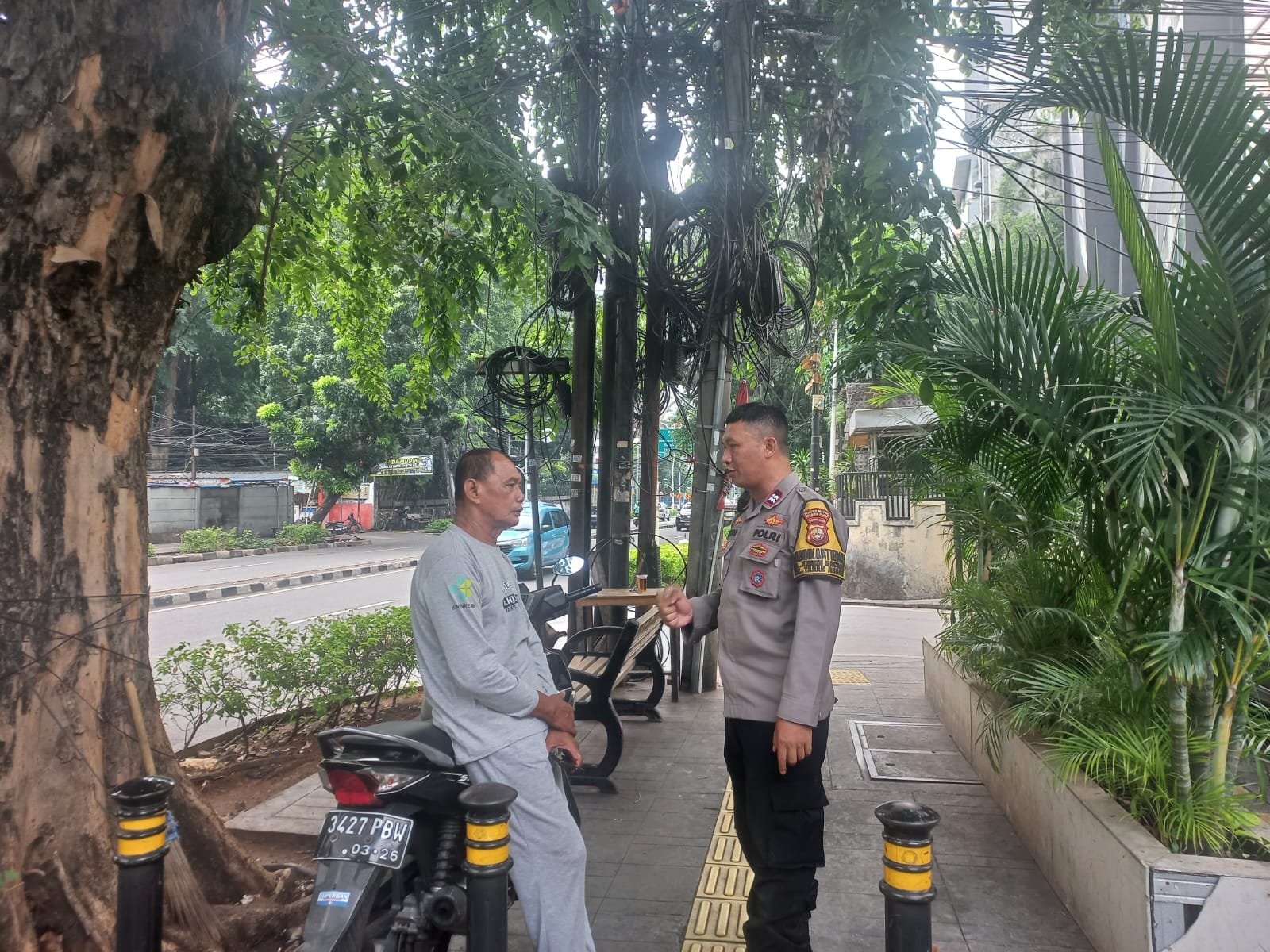 Jakarta Pusat — Bhabinkamtibmas Kelurahan Kebon Kacang Aiptu Suhartono melaksanakan kegiatan sambang dan patroli ke pangkalan ojek di Jalan Wahid Hasyim RW 02, Kebon Kacang, Tanah Abang, Jakarta Pusat, pada Jumat, (16/1/2025). pagi hari.