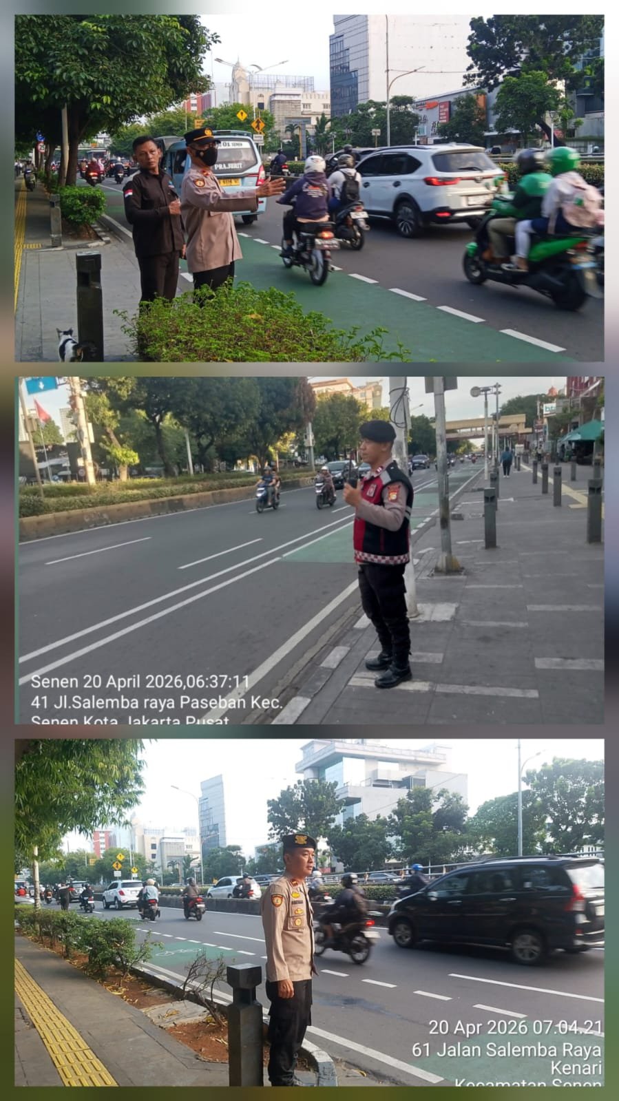 Jakarta — Personel Polsek Senen melaksanakan kegiatan pengaturan lalu lintas (gatur lalin) pada Senin (20/4/2026) pagi di kawasan Jalan Salemba Raya, Kecamatan Senen, Jakarta Pusat.