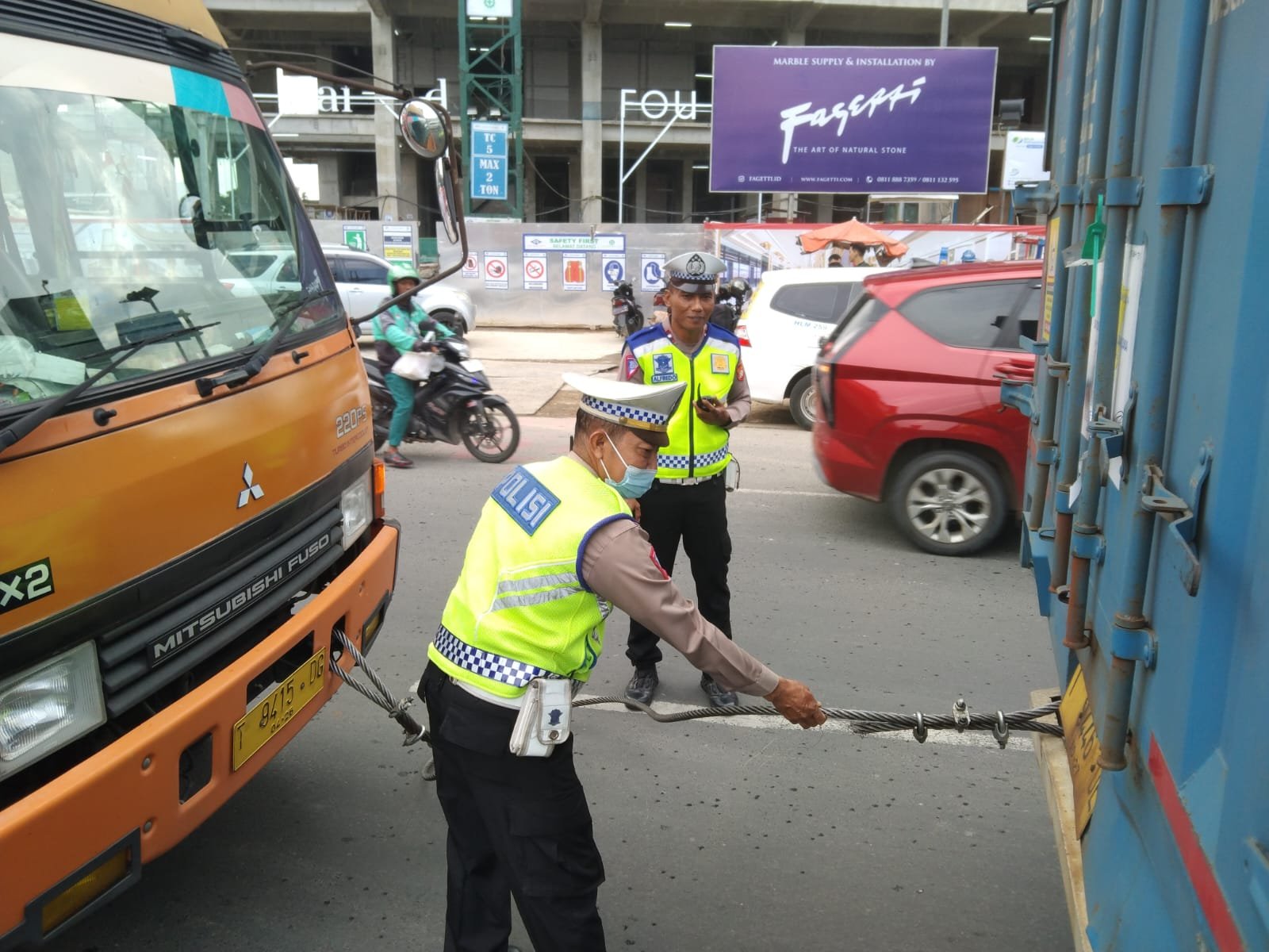 Satu petugas mengatur lalu lintas agar tidak terjadi kemacetan sementara seorang lagi membantu proses pemasangan kabel seling kekedua truk. Tak butuh waktu lama, truk pun sudah bisa dipinggirkan ke pinggir jalan yang aman dan tidak menimbulkan kemacetan.