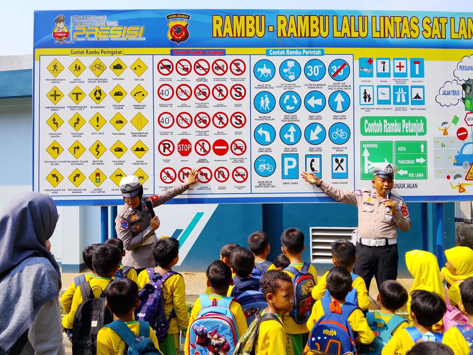 Dalam kegiatan tersebut, Muthia menjelaskan, puluhan murid ini ikut belajar bersama polisi lalu lintas di Mapolres Purwakarta. Mereka tampak riang menyimak bapak-bapak polisi yang mengenalkan simbol rambu lalu lintas.