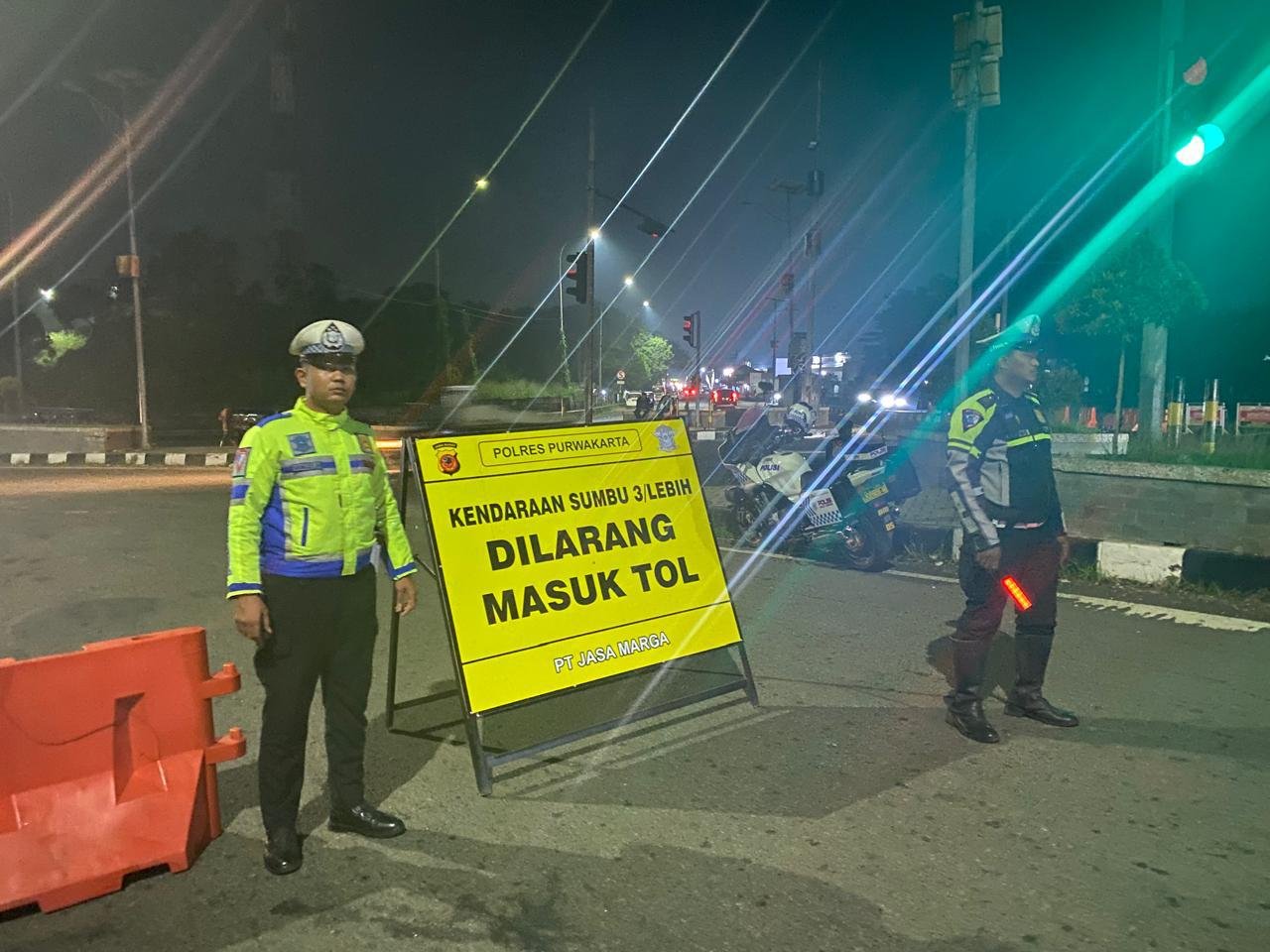 Di Purwakarta, Satlantas Polres Purwakarta menggelar rekayasa lalu lintas berupa pengalihan arus dan pembatasan operasional angkutan barang kendaraan sumbu 3 yang akan memasuki gerbang tol dan masih berada di dalam tol, pada Senin, 24 Maret 2024, dini hari.