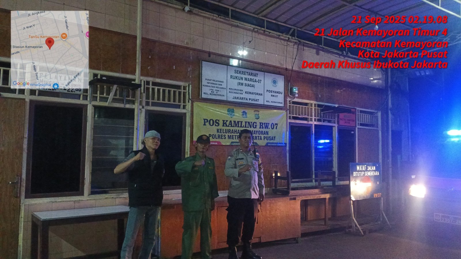 refubliknews.com, || Jakarta Pusat – Bhabinkamtibmas Kelurahan Kemayoran, Aiptu Dwi Yulianto, bersama anggota Pokdarkamtibmas melaksanakan patroli sekaligus sambang ke Pos Kamling RW 07, Kelurahan Kemayoran, Jakarta Pusat, pada Minggu (21/9/2025) dini hari.