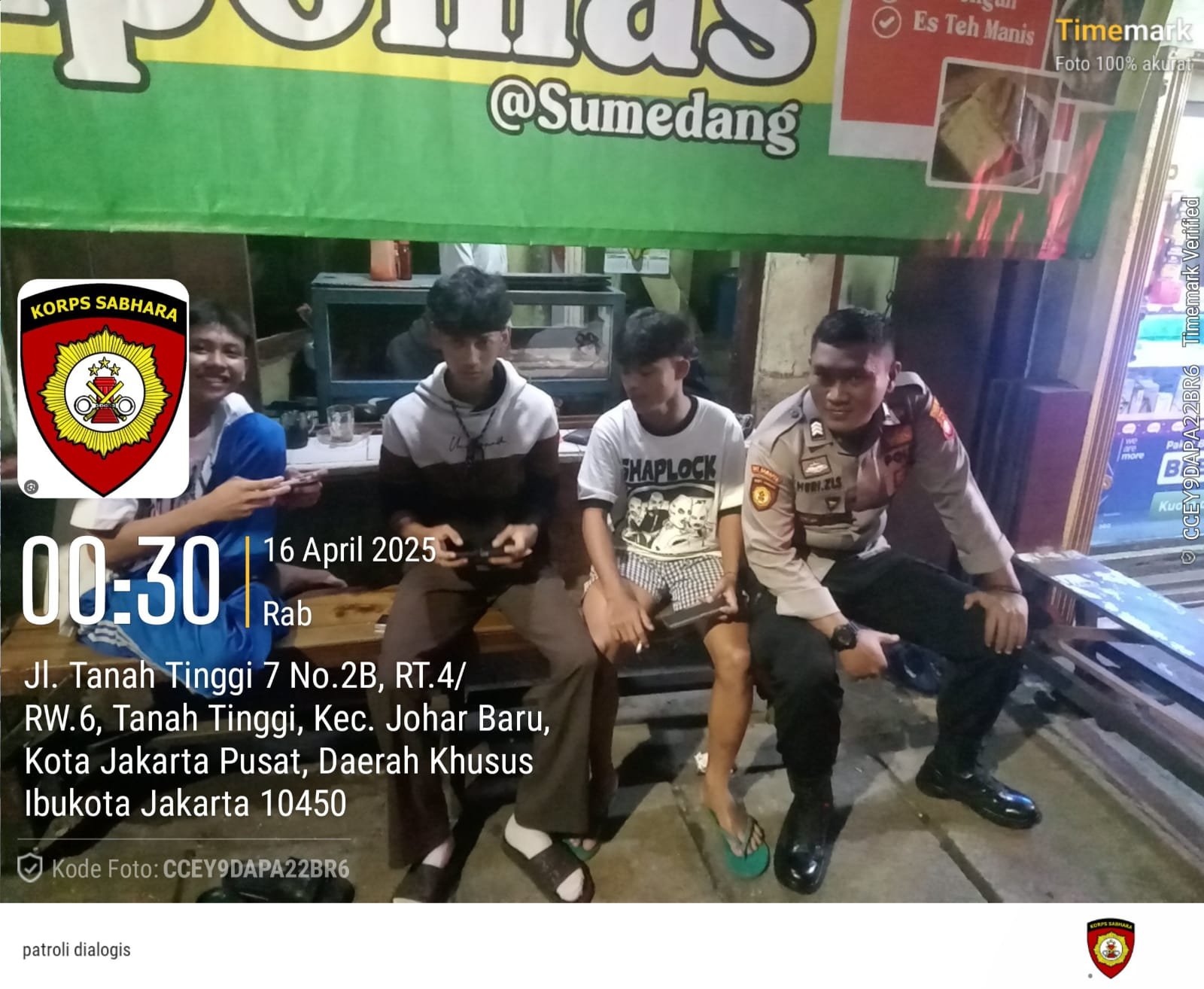 refubliknews.com, || Jakarta Pusat – Pada Rabu, 16 April 2025, pukul 00.30 WIB, Kapolsubsektor Tanah Tinggi Antonius Andi Wibowo bersama anggota Patroli Regu 1 Polsek Johar Baru, Brigadir Heri Poerwanto, melaksanakan patroli dialogis di wilayah Pasar Gaplok, Jalan Kramat Pulo Gundul, RW 06, Kelurahan Tanah Tinggi, Kecamatan Johar Baru, Jakarta Pusat. Dalam kegiatan tersebut, petugas bertemu dengan warga setempat, yakni Sdr Dani, Erwin, dan Fatih.