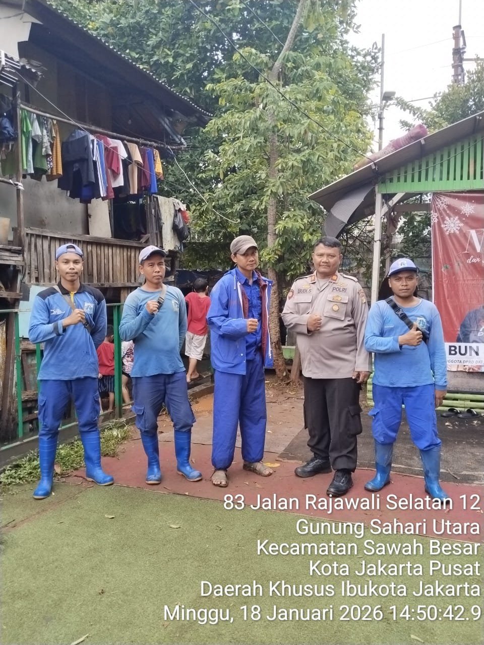 Jakarta Pusat — Wujud pelaksanaan tugas pokok Polri sebagai pelindung, pengayom, dan pelayan masyarakat kembali ditunjukkan jajaran Polsek Sawah Besar. Kapolsubsektor Rajawali IPTU Budi Santoso, S.H. bersama unsur Tiga Pilar dan warga turun langsung ke lapangan melakukan pengecekan genangan air dan kondisi pemukiman, Minggu (18/1/2026) sekitar pukul 14.50 WIB, di wilayah Kelurahan Gunung Sahari Utara, Jakarta Pusat, meski masih diguyur hujan rintik-rintik.