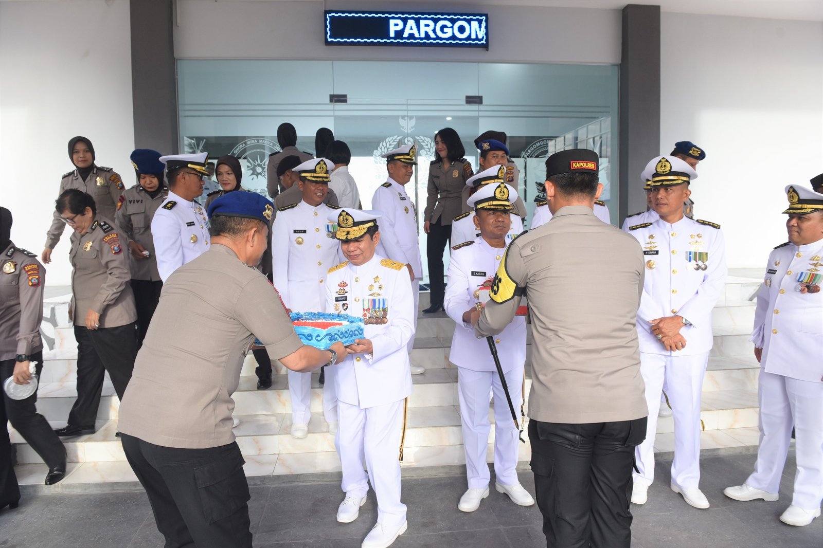 TNI AL, Belawan,- Komandan Pangkalan Utama TNI Angkatan Laut (Danlantamal I) Laksamana Pertama TNI Johanes Djanarko Wibowo diwakili Kaotmilti I Medan Laksamana Pertama TNI Efendi Maruapey menerima surprise dari Kapolres Belawan AKBP Josua Tampubolon dan Dirpolairud Polda Sumatera Utara yang diwakili Wadirpolairud AKBP Erwin Siahaan beserta rombongan, bertempat di Ruang Lobi Mako Lantamal I, Jalan Serma Hanafiah No. 01 Belawan, Sumatera Utara, Senin (11/9/2023).