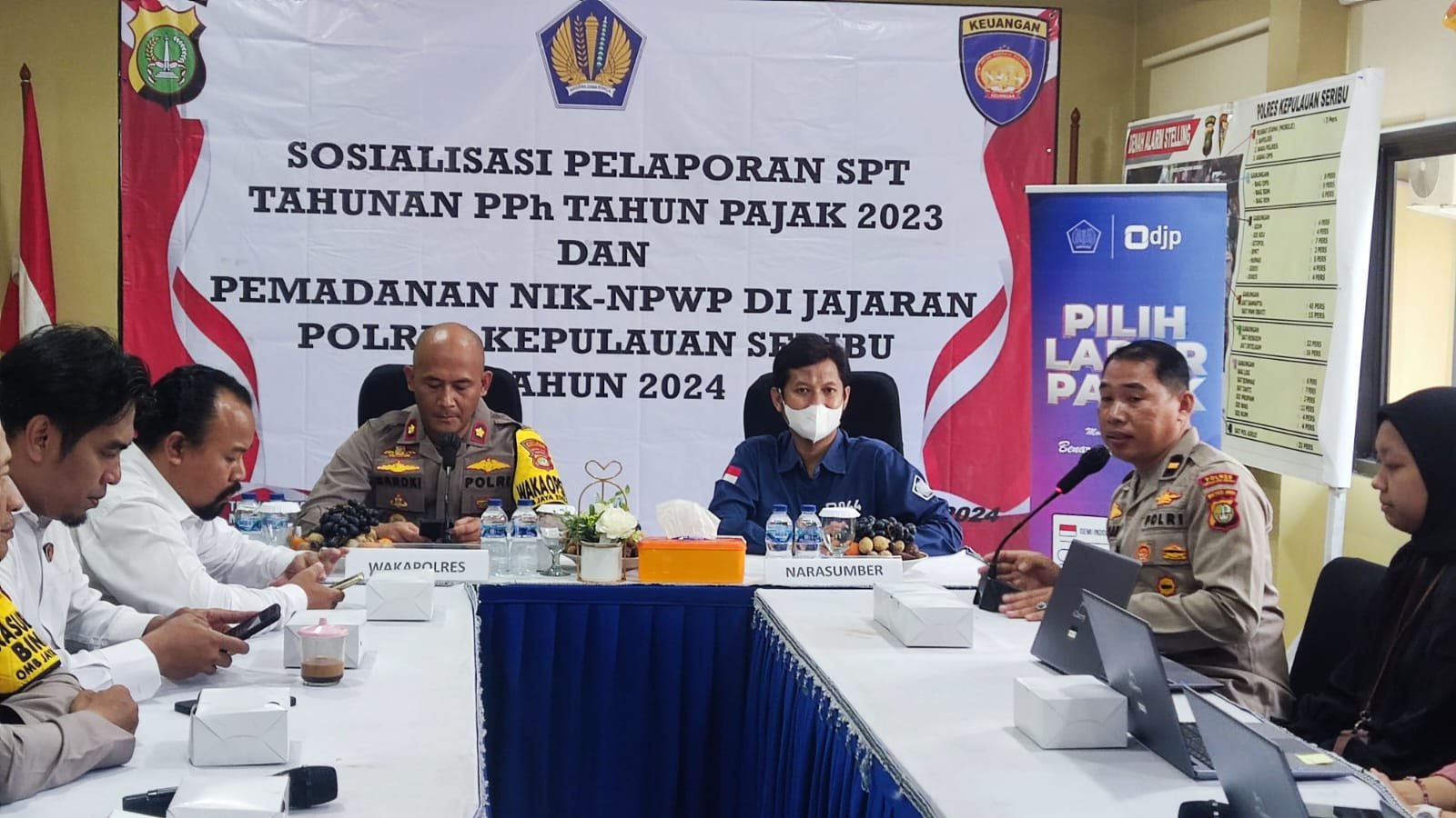 Jakarta – Dalam upaya memberikan kemudahan administratif bagi anggota, Polres Kepulauan Seribu menggelar kegiatan sosialisasi tentang pemadanan Nomor Induk Kependudukan (NIK) menjadi Nomor Pokok Wajib Pajak (NPWP) dan pelaporan Surat Pemberitahuan Tahunan (SPT) pajak. Kegiatan ini merupakan kerjasama antara Polres Kepulauan Seribu dengan Kantor Pelayanan Pajak (KPP) Pratama Pademangan, yang diselenggarakan di Aula Wichaksana Laghawa Polres Kepulauan Seribu, Marina Ancol Jakarta, pada Kamis (07/03/2024).