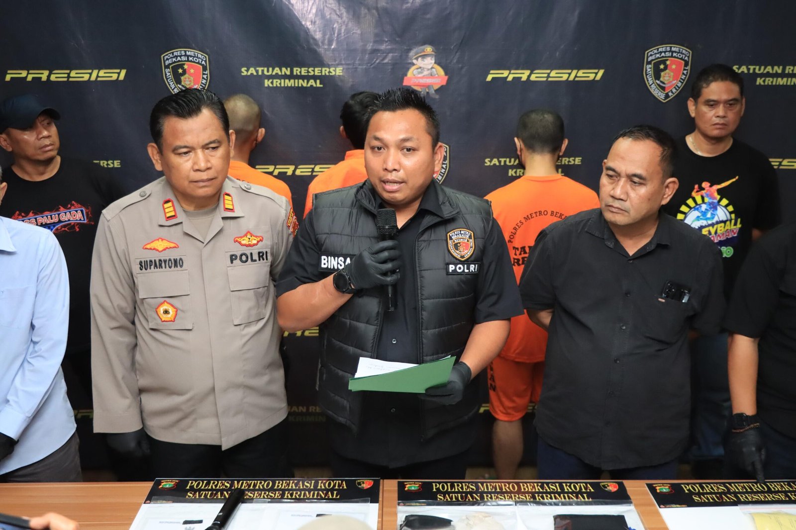 Konferensi pers ini dipimpin oleh Kasat Reskrim Polres Metro Bekasi Kota, Kompol Binsar Hatorangan Sianturi, S.H., S.I.K., M.Si., didampingi oleh Kasi Humas Polres Metro Bekasi Kota, AKP Suparyono, S.H.