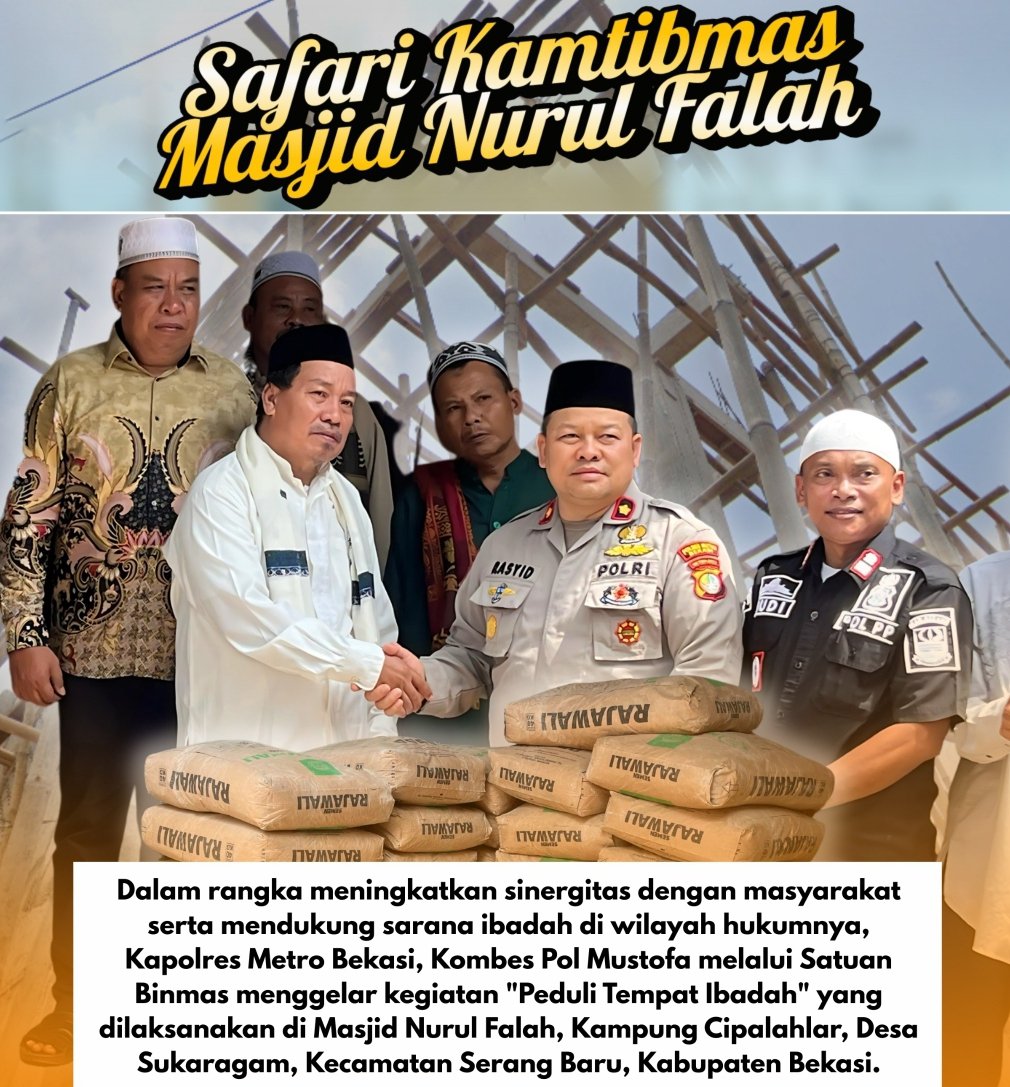 refubliknews.com,- Bekasi – Jumat, 9 Mei 2025, Dalam rangka meningkatkan sinergitas dengan masyarakat serta mendukung sarana ibadah di wilayah hukumnya, Polres Metro Bekasi melalui Satuan Binmas menggelar kegiatan “Peduli Tempat Ibadah” yang dilaksanakan di Masjid Nurul Falah, Kampung Cipalahlar, Desa Sukaragam, Kecamatan Serang Baru, Kabupaten Bekasi.