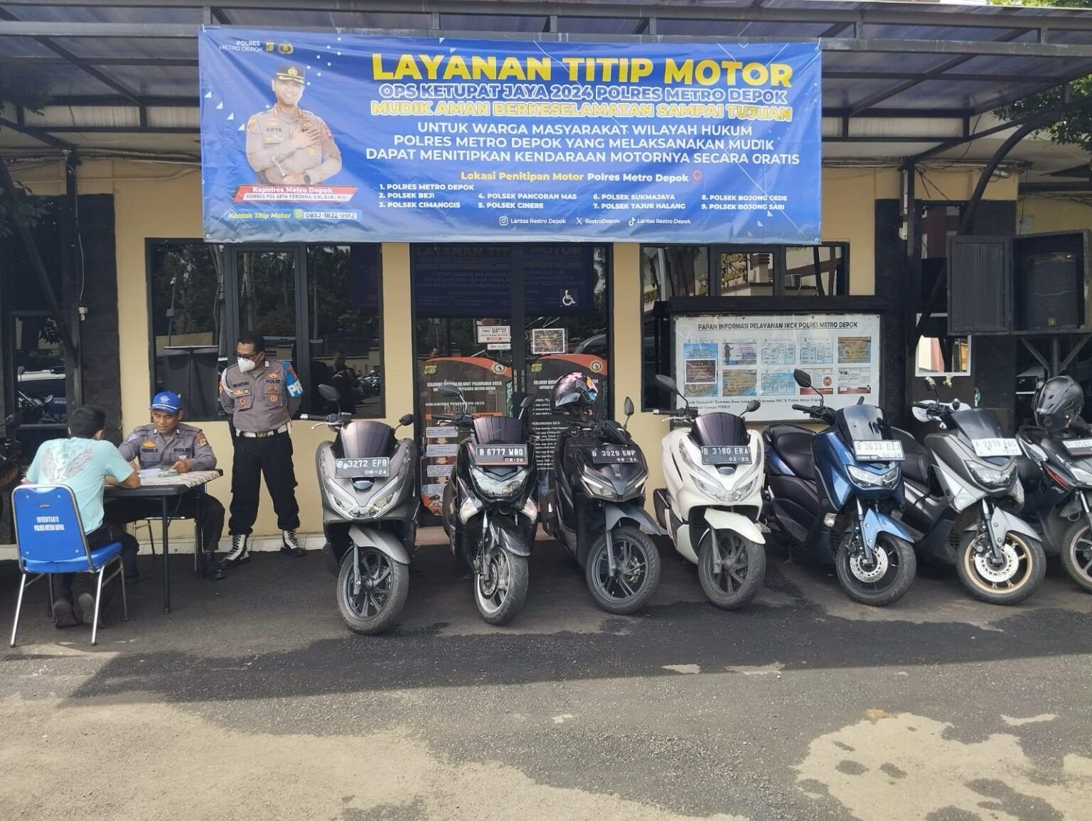 Depok – Dalam rangka memberikan kenyamanan dan keamanan bagi para pemudik yang akan merayakan Hari Raya Idul Fitri dan menindak lanjuti perintah Kapolda Metro Jaya Irjen Pol Karyoto S.I.K, Polres Metro Depok beserta Polsek Jajaran memberikan layanan titip motor gratis. Senin (8/04/24)