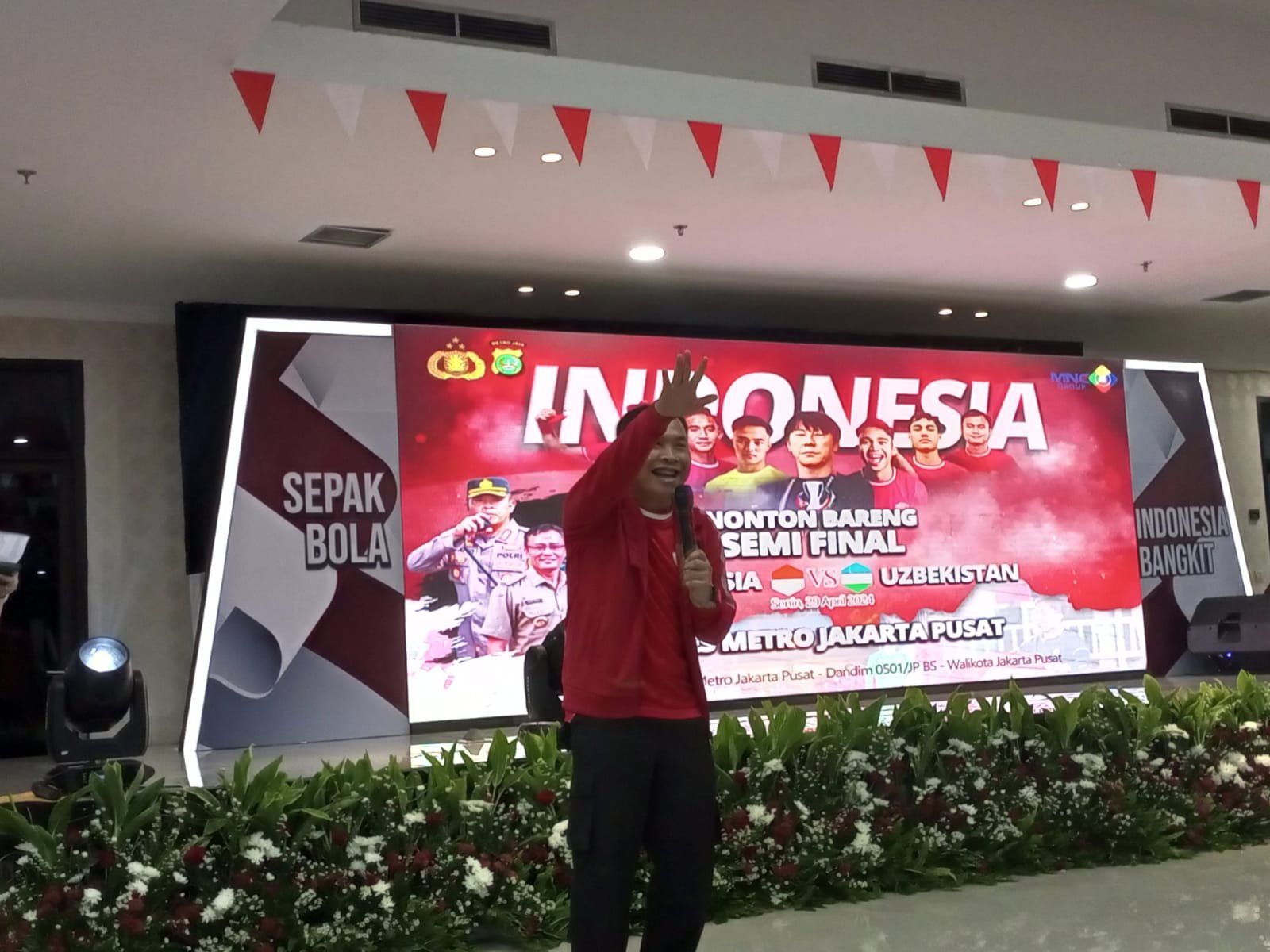 Kapolres Metro Jakarta Pusat Kombes Pol Susatyo Purnomo Condro mengatakan nonton bareng pertandingan Indonesia vs Uzbekistan ini adalah salah satu bentuk support kami terhadap Timnas Indonesia yang sudah berhasil lolos ke babak semifinal dan mudah-mudahan malam ini Tim Nasional Indonesia kembali mendapatkan kemenangan guna memastikan satu tiket ke Olimpiade Paris.