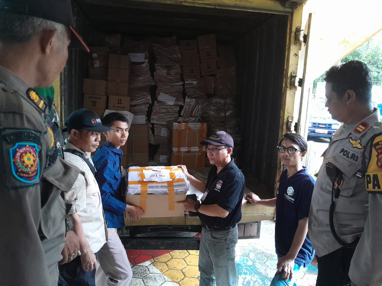 Logistik Pemilu dikirim ke Gudang Logistik Pemilu PPK Kemayoran dengan pengawalan anggota.