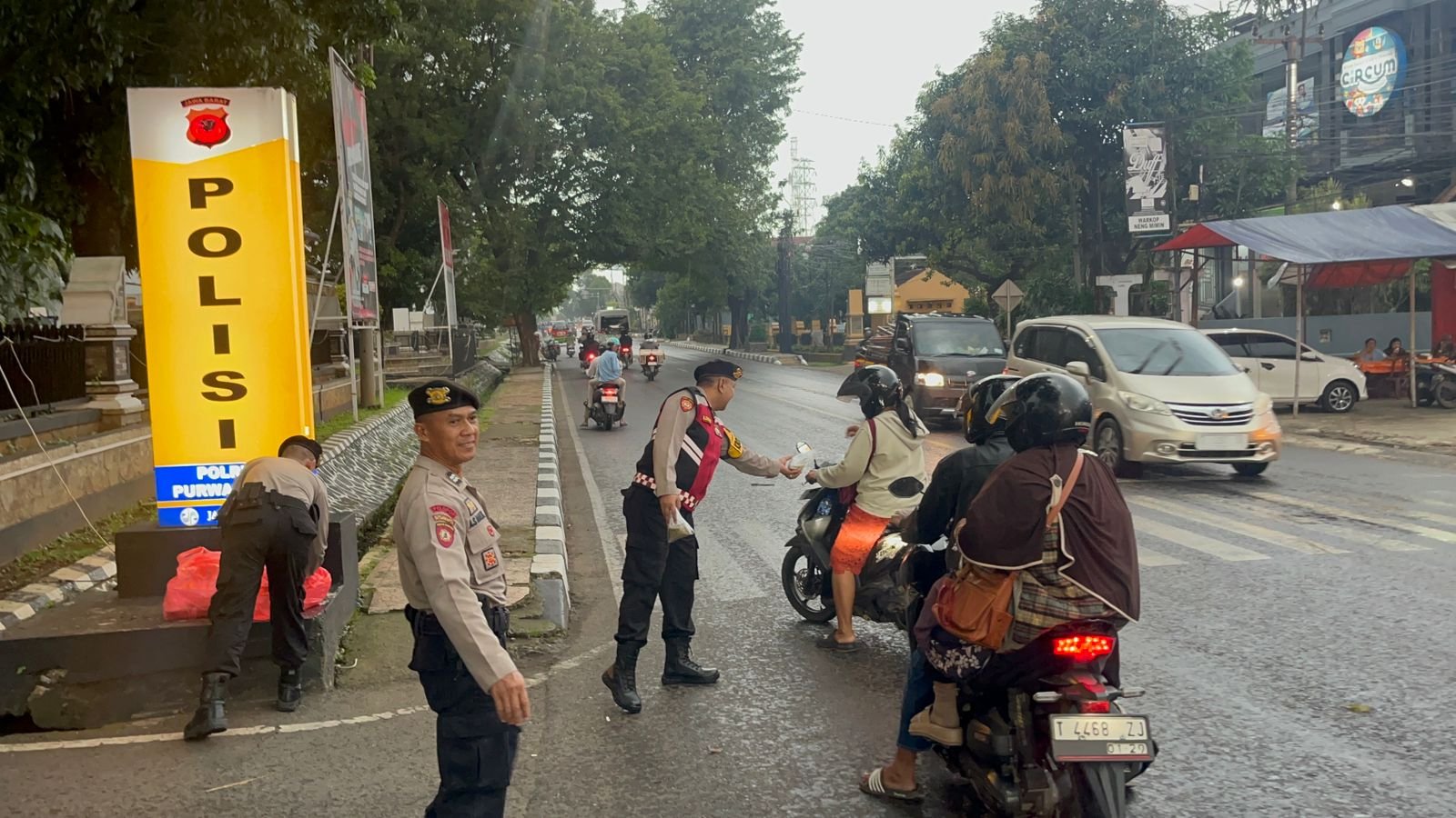 Dengan penuh kehangatan, para personel Sat Samapta Polres Purwakarta turun langsung ke jalan membagikan takjil kepada pengendara maupun warga yang melintas.