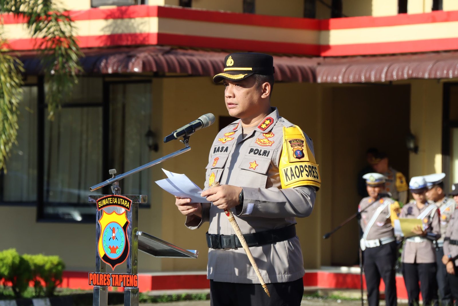 Kapolres Tapteng, AKBP Basa Emden Banjarnahor, S.I.K., M.H., dalam kesempatan tersebut membacakan amanat Kapolri Jenderal Polisi Listyo Sigit Prabowo, M.Si menyampaikan bahwa demi menjamin keamanan Nataru, Polri bersama TNI dan stakeholder terkait menggelar Operasi Kepolisian Terpusat dengan sandi “Operasi Lilin 2024” yang akan berlangsung selama 13 hari, mulai dari tanggal 21 Desember 2024 s.d. 2 Januari 2025.