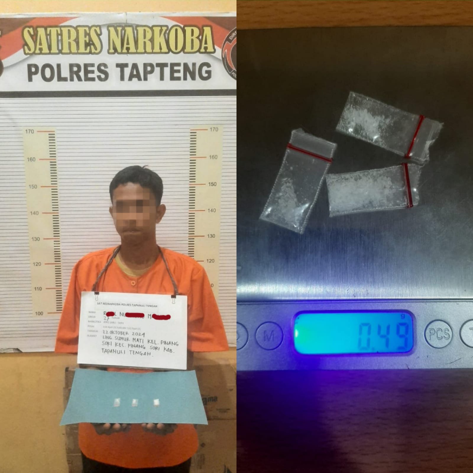Tim Opsnal Sat Narkoba Polres Tapteng melakukan penggerebekan dan penangkapan pelaku tersangka di tempat kejadian perkara (TKP), dan berhasil diamankan barang bukti berupa 3 (tiga) paket kecil narkotika jenis sabu yang dibungkus plastik bening, terletak di atas tempat tidur pelaku.