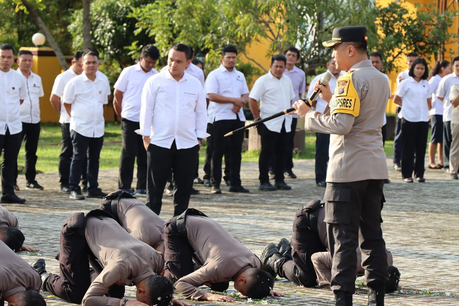 Sebagai bagian dari tradisi penyambutan, AKBP Wahyu Endrajaya didampingi PJU melakukan penyiraman air kembang kepada para Bintara Remaja. Tradisi ini melambangkan kebersihan, kesucian, dan semangat baru dalam menjalankan tugas sebagai anggota Polri.