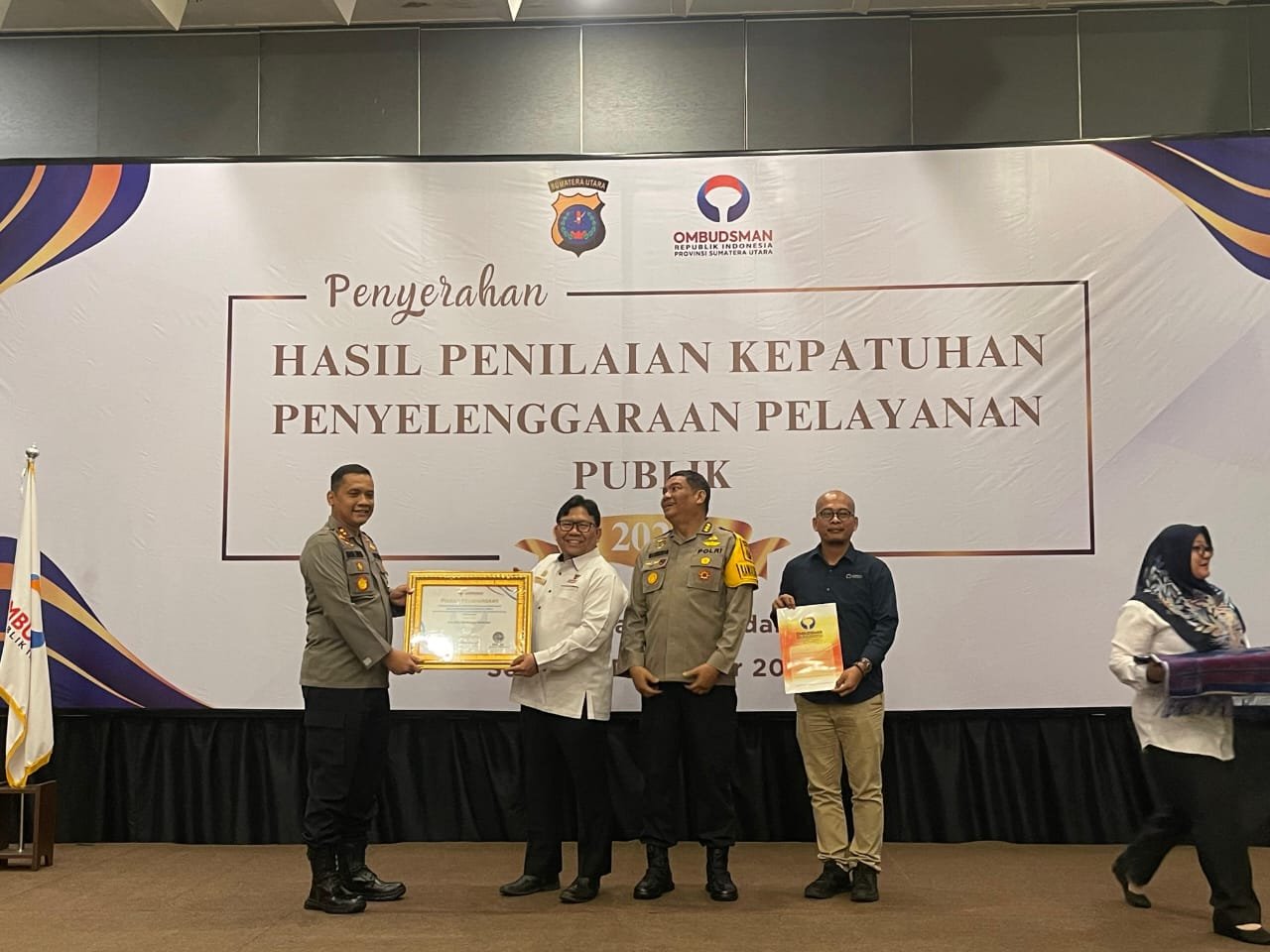 Piagam Penghargaan kepada Polres Tapteng diterima langsung oleh Kapolres Tapteng AKBP Basa Emden Banjarnahor, SIK, MH yang diserahkan oleh Pimpinan Ombudsman RI, didampingi Irwasda Polda Sumut Kombes Pol. Nanang Masbudi, SIK, M.Si, CFrA.