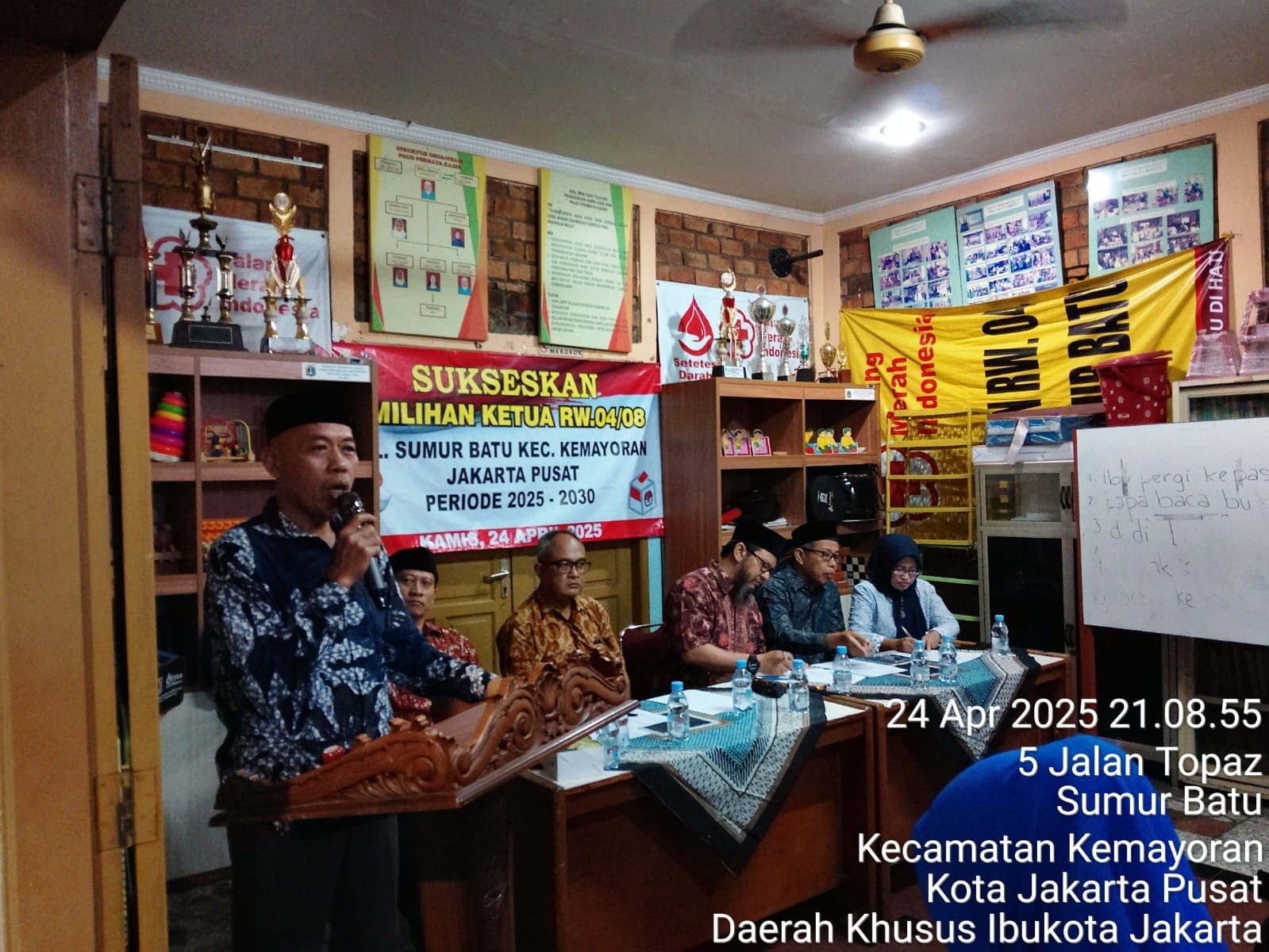 refubliknews.com, || Jakarta Pusat – Pemilihan Ketua RW 004 Kelurahan Sumur Batu, Kecamatan Kemayoran, Jakarta Pusat, untuk periode 2025–2030 berlangsung malam ini, Kamis (24/4/2025). Kegiatan yang digelar di Kantor Sekretariat RW 004, Jalan Topas RT 008 RW 004, dimulai pukul 20.00 WIB dan berakhir pukul 21.30 WIB dalam suasana aman dan tertib.