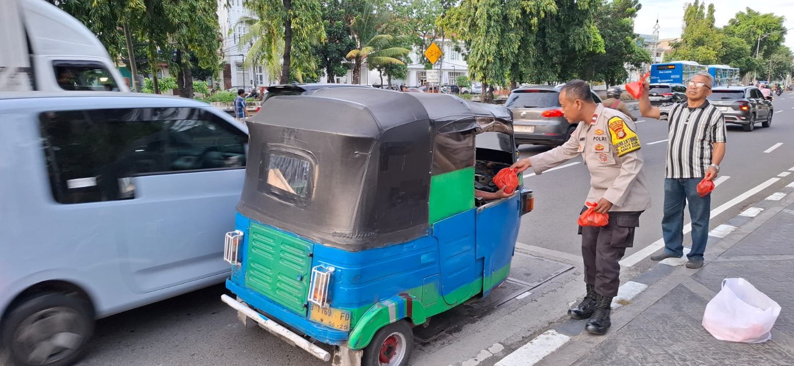 Kapolsubsektor Pasar Baru, IPTU Syafrizal, bersama Bhabinkamtibmas Pasar Baru Aipda Bambang dan personel lainnya, turun langsung ke jalan untuk membagikan takjil kepada pengemudi bajaj, ojek online, serta pengendara mobil yang melintas di depan Polsubsektor Pasar Baru, Jalan Pos Raya No. 2. Sebanyak 100 bungkus takjil disalurkan kepada masyarakat sebagai bentuk kepedulian dan dukungan dalam menjalankan ibadah puasa.