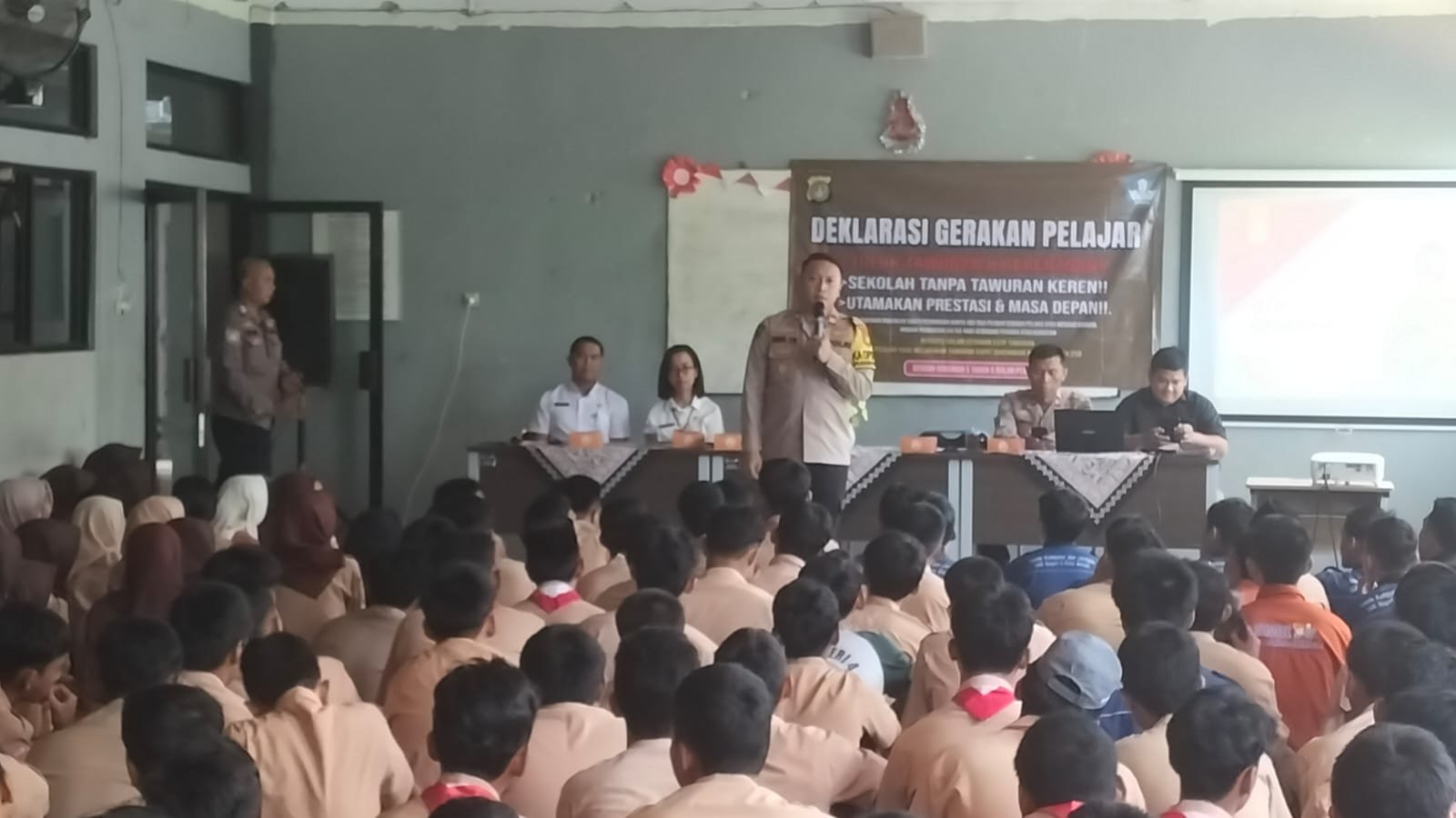 Kapolsek Jatisampurna memberikan arahan kepada para siswa mengenai bahaya kenakalan remaja, khususnya tawuran yang akhir-akhir ini marak terjadi. Penyuluhan ini bertujuan agar para siswa memahami dampak buruk tawuran dan kekerasan, serta terdorong untuk menghindari perilaku tersebut.