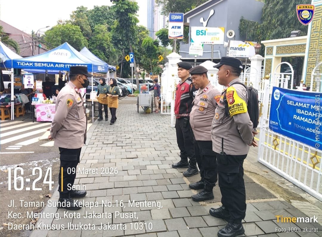 Jakarta Pusat – Dalam rangka menjaga situasi keamanan dan ketertiban masyarakat selama bulan suci Ramadhan, jajaran Polsek Metro Menteng melaksanakan kegiatan pelayanan dan pengamanan pasar tumpah Ramadhan di kawasan Masjid Agung Sunda Kelapa yang berlokasi di Jalan Taman Sunda Kelapa No. 16, Menteng, Jakarta Pusat. Senin (9/3/2026)