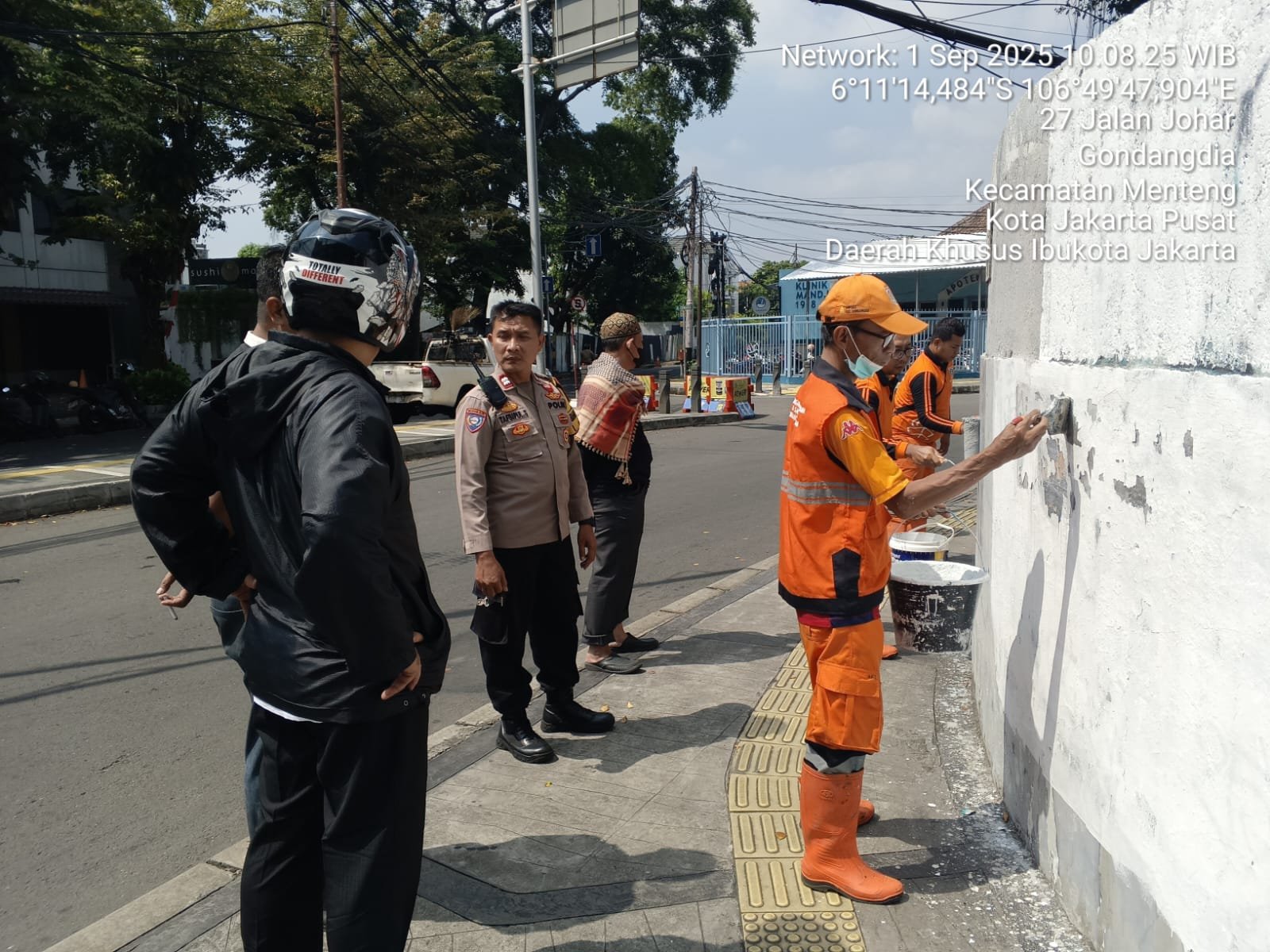 refubliknews.com, || Jakarta Pusat – Upaya menjaga kondusivitas serta keindahan lingkungan kembali ditunjukkan oleh jajaran Polsek Metro Menteng dengan melaksanakan kegiatan pengecekan dan penghapusan vandalisme di kawasan TL. Cemara, Jalan Hos Cokroaminoto, Gondangdia, Menteng, Jakarta Pusat, Senin (1/9/2025).