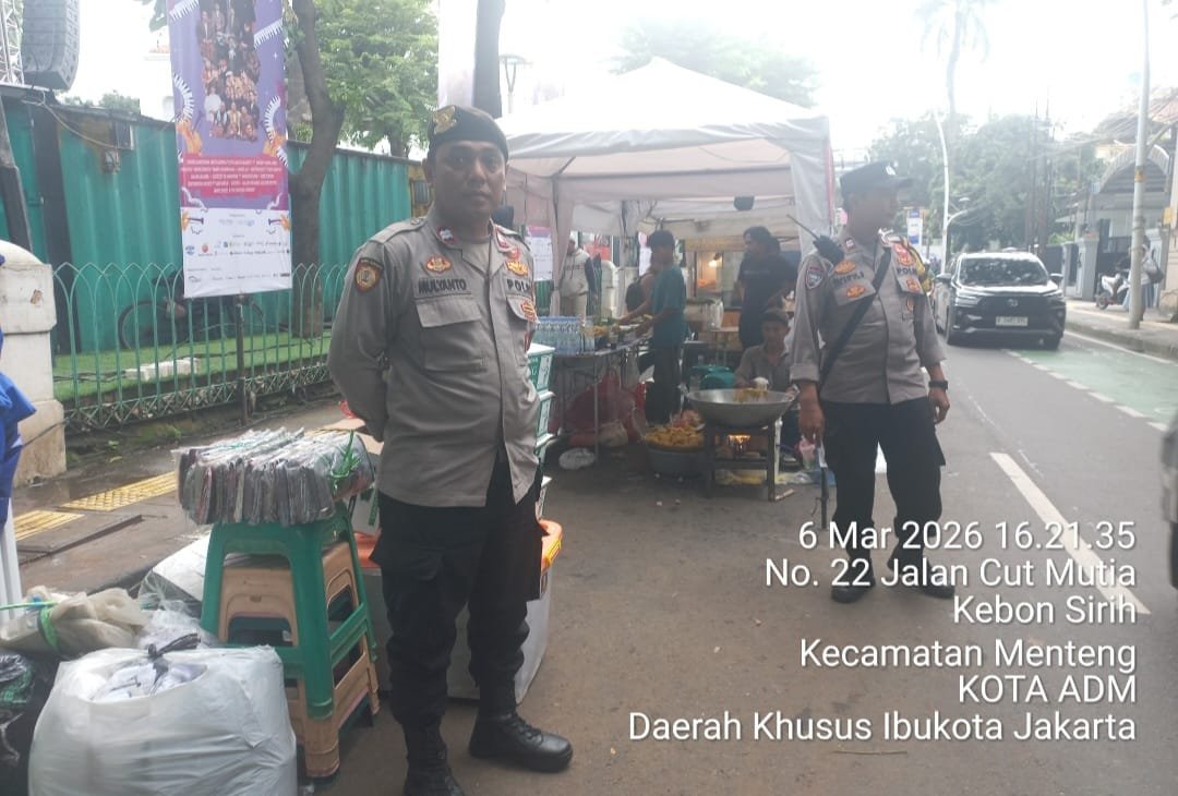 Jakarta Pusat – Dalam rangka memberikan pelayanan dan menjaga situasi keamanan serta ketertiban masyarakat selama bulan suci Ramadhan, personel Polsek Metro Menteng melaksanakan pengamanan kegiatan pasar tumpah Ramadhan di kawasan Masjid Cut Meutia, yang berada di Jalan Taman Cut Mutia, Cikini, Menteng, Jakarta Pusat. Jumat (6/3/2026)