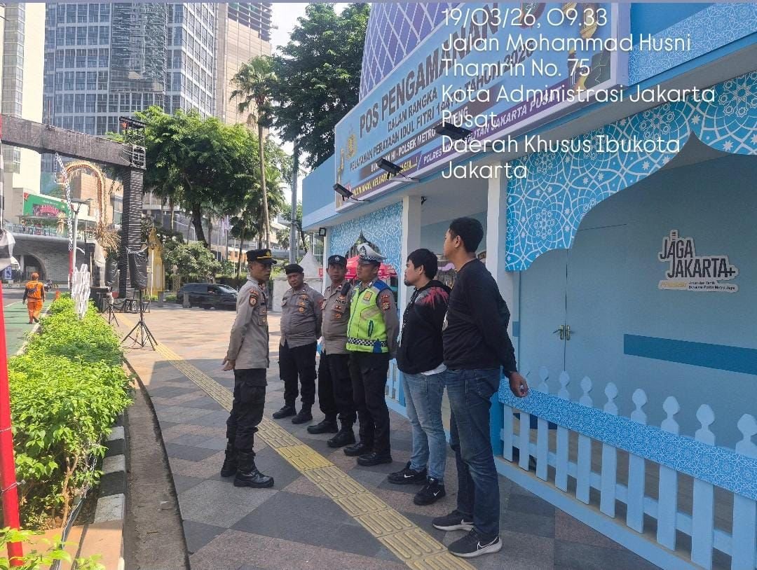 Jakarta Pusat – Dalam rangka memastikan keamanan dan kenyamanan masyarakat selama perayaan Hari Raya Idulfitri, jajaran Polsek Metro Menteng melaksanakan pengamanan intensif melalui Pos Pengamanan (Pospam) Operasi Ketupat Jaya 2026 di kawasan Bundaran Hotel Indonesia (HI), Jalan MH Thamrin, Menteng, Jakarta Pusat. Kegiatan ini dipimpin langsung oleh Kapospam IPtu Agung Sukiswo dengan dukungan 11 personel yang disiagakan untuk menjaga stabilitas keamanan di salah satu titik paling vital di ibu kota. Kamis (19/3/2026)