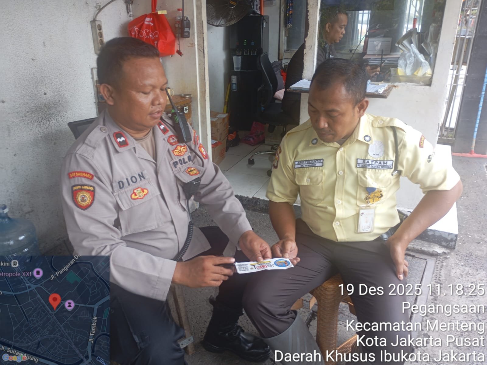 Jakarta Pusat – Dalam rangka memperkuat pelayanan kepolisian yang cepat, transparan, dan berbasis teknologi, anggota Samapta Polsek Metro Menteng bersama Aipda Dion Sinaga melaksanakan kegiatan sosialisasi Barcode Sahabat Patroli Polisi dengan menempelkan stiker barcode di Jalan Penataran, Kelurahan Pegangsaan, Menteng, Jakarta Pusat. Jumat (19/12/2025)