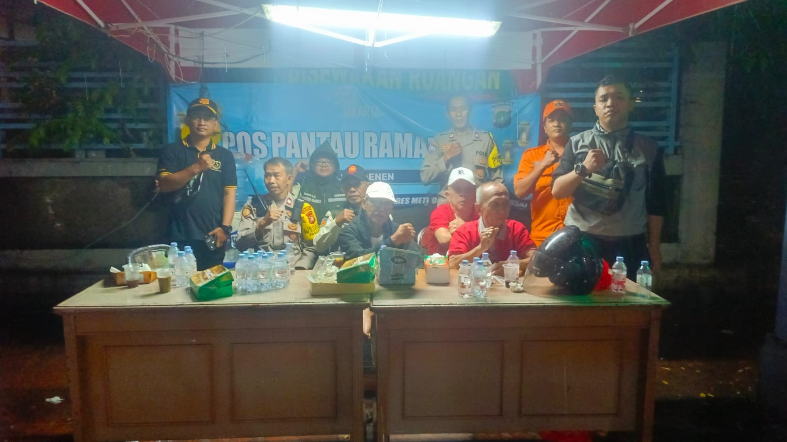Petugas kepolisian bersama unsur masyarakat melaksanakan kegiatan pengamanan melalui Pos Pantau Ramadhan di kawasan Jalan Salemba Tengah (Simpang Mencos), RW 03, Kelurahan Paseban, Kecamatan Senen, Jakarta Pusat, Minggu (8/3/2026) dini hari.