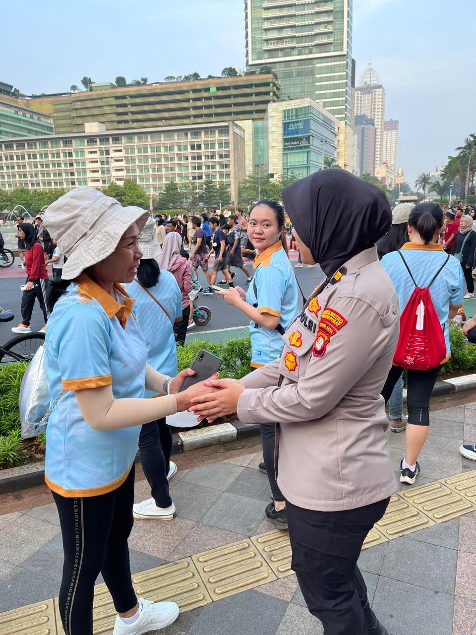 Jakarta Pusat – Polisi Wanita (Polwan) Polres Metro Jakarta Pusat bersama personil Polri lainnya disela-sela kesibukan setiap harinya yang padat masih menyempatkan waktunya setiap hari Minggu ikut mengamankan dan memberikan pelayanan kepada warga masyarakat yang melaksanakan olah raga pagi bersama keluarga maupun sanak saudaranya di sepanjang jalan MH Thamrin dan Bundaran HI Menteng Jakarta Pusat. Minggu (2/6/2024).
