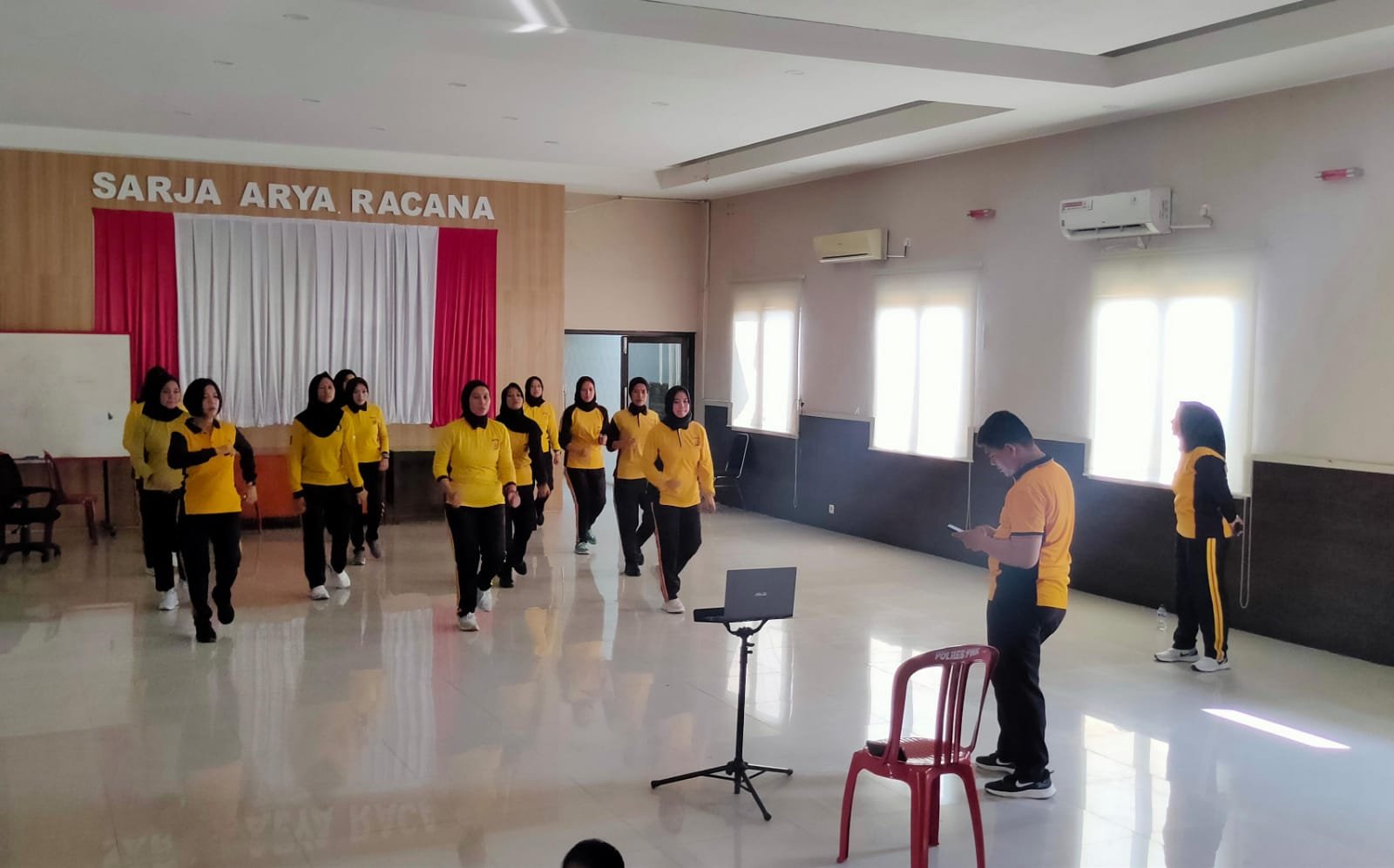 Purwakarta – Personel Polisi Wanita (Polwan) Polres Purwakarta, Polda Jawa Barat lakukan latihan senam lalu lintas di Aula Sarja Arya Racana, Mapolres Purwakarta,
