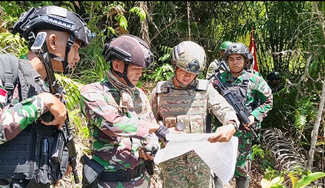 Kalbar – Potret keakraban terlihat saat Satgas Pamtas Yonarmed 10/ Bradjamusti dan Satgas Pamtas Batalyon 13 Rejemen Askar Melayu dari Tentera Diraja Malaysia (TDM) menggelar patroli patok perbatasan secara gabungan di sektor wilayah Kompi 1, mulai dari Pos Klawik, Pos Kapar, Pos Seriang, Koki Mentari dan Pos Perumbang. (5/2/2024).
