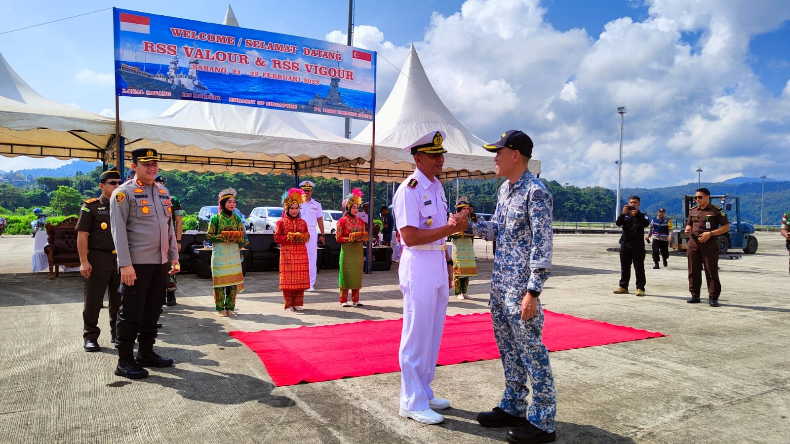 TNI AL, Sabang,- Komandan Lanal Sabang Kolonel Laut (P) Ali Setiandy, M.Tr (Han)., M.M., bersama FKPD Kota Sabang menyambut Kedatangan 2 (dua) Kapal Perang Singapura RSS Valour (89) dan RSS Vigour (92) di Sabang dalam rangka Port Call, bertempat di Pelabuhan CT-3 Sabang, Selasa (21/02/2023).