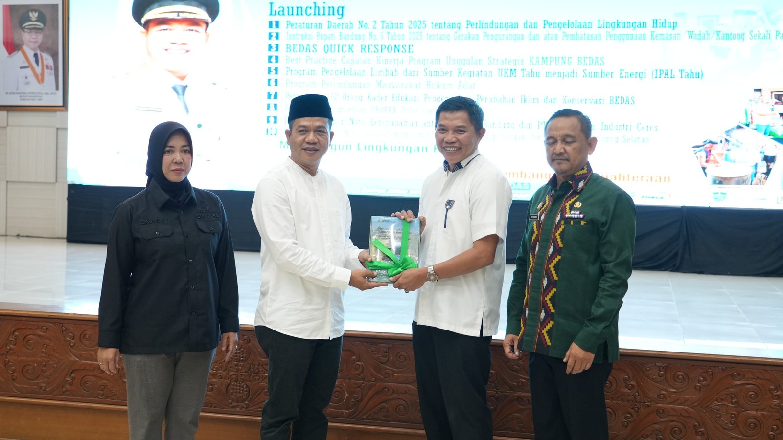 Pertama, launching Peraturan Daerah No 2 tahun 2025 tentang Perlindungan dan Pengelolaan Lingkungan Hidup. Kedua, launching Instruksi Bupati Bandung No 5 tahun 2025 tentang Gerakan Pengurangan dan atau Pembatasan Pengurangan Kemasan/Wadah/Kantong Sekali Pakai di Kabupaten Bandung.