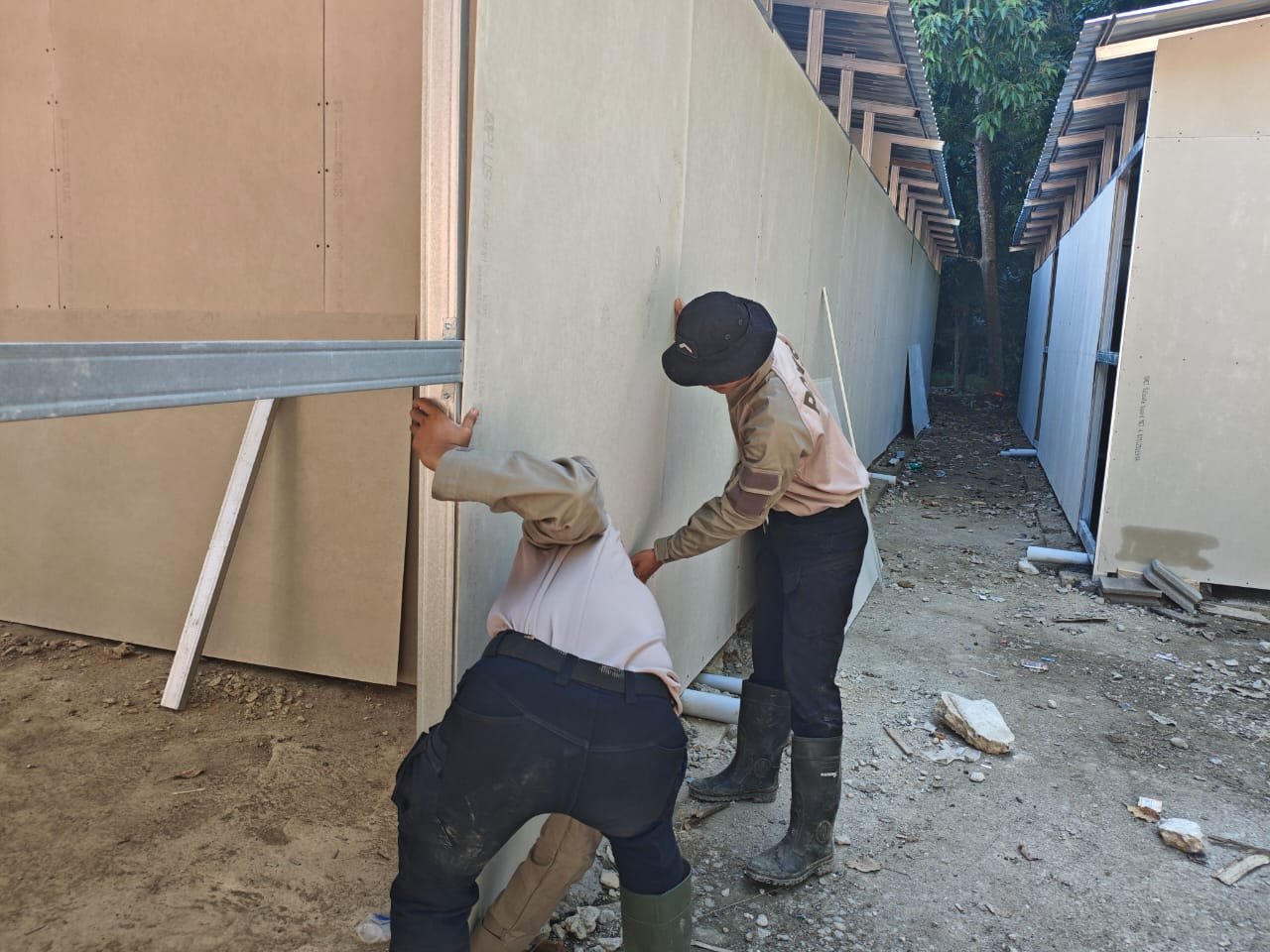 Kerangka baja ringan untuk tiang rumah juga telah terpasang pada 22 unit rumah. Pemasangan dinding GRC saat ini sedang berlangsung pada 22 unit rumah, bersamaan dengan pengerjaan teras untuk jumlah unit yang sama.Selain itu, penggalian septic tank telah dilakukan sebanyak 6 lubang. Untuk atap rumah, pemasangan seng telah siap pada 22 unit rumah.