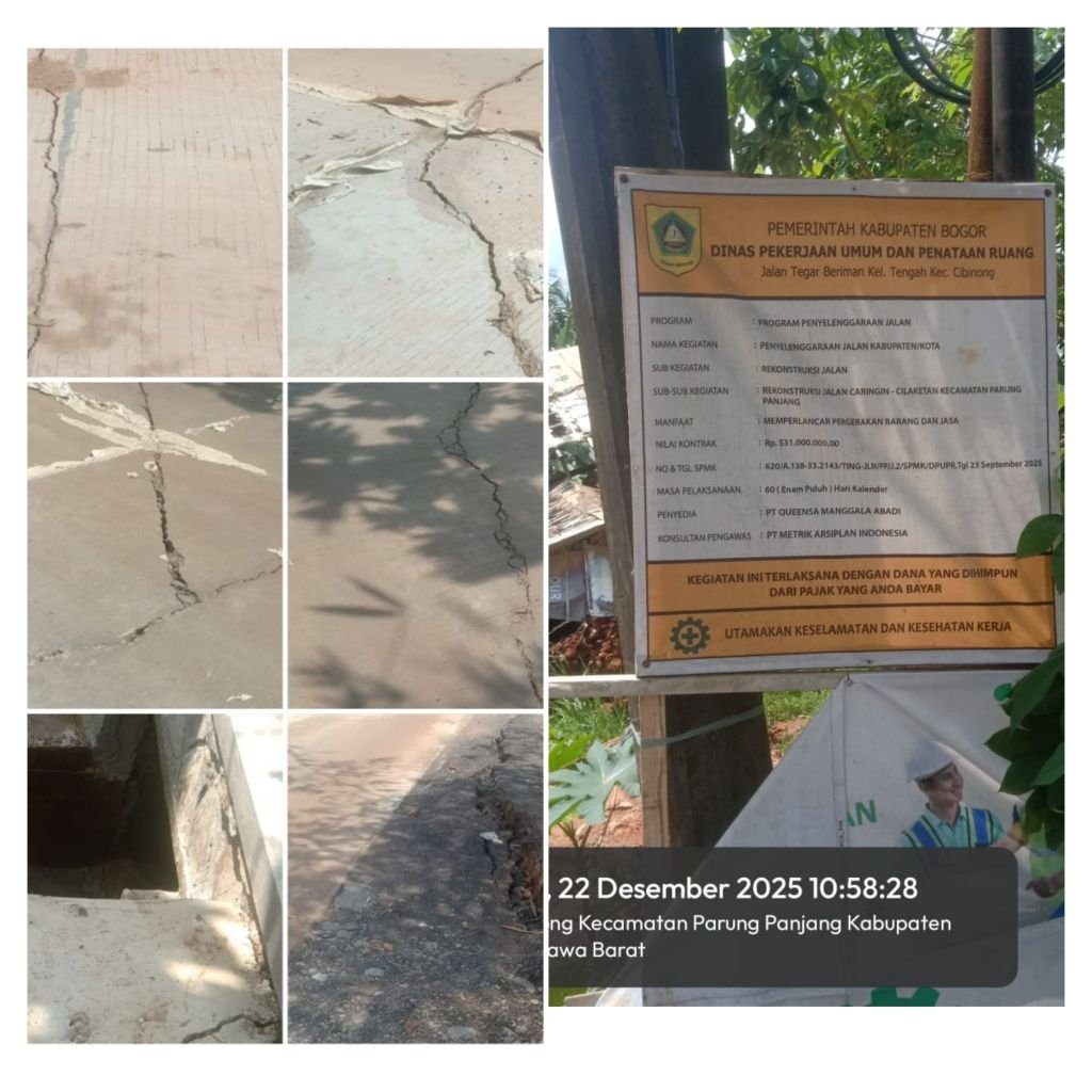 refubliknews.com, || BOGOR – Proyek pembangunan infrastruktur jalan kabupaten pada ruas Caringin–Cilaketan, tepatnya di Kampung Lebak Ciung, Desa Gorowong, kini menjadi sorotan tajam masyarakat. Pasalnya, proyek betonisasi yang menelan anggaran Rp 531.000.000 dari APBD Kabupaten Bogor tersebut dilaporkan telah mengalami kerusakan meski usia bangunan belum genap satu bulan.Senin (23/12/2025)