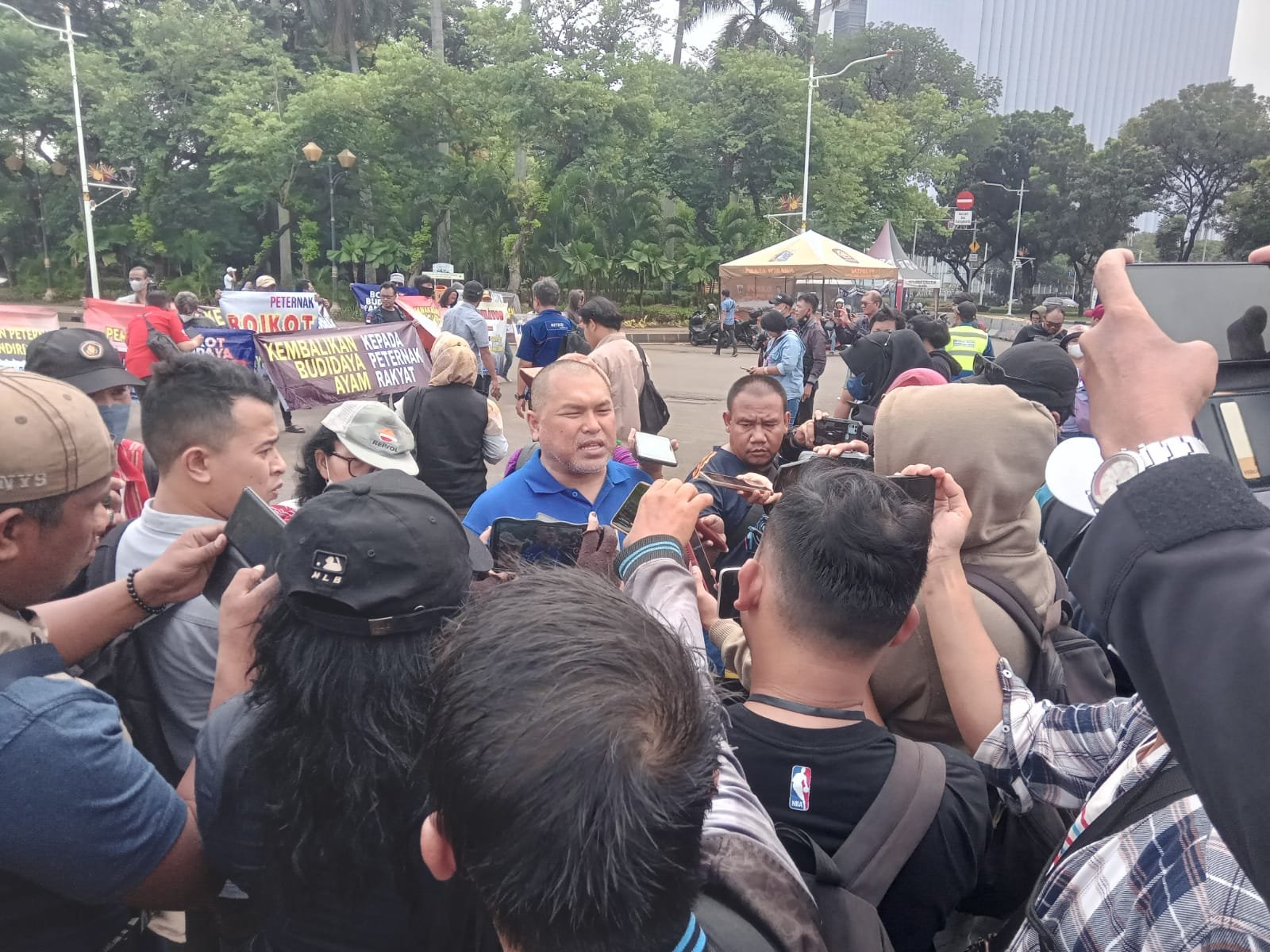 Puluhan para peternak unggas mandiri Indonesia yang tergabung di Komunitas Peternak Unggas Nasional (KPUN) menggelar aksi simpatik di depan Patung Kuda, Jl. Medan Merdeka Barat,Gambir,Jakarta Pusat.Kamis, (11/01/2024).