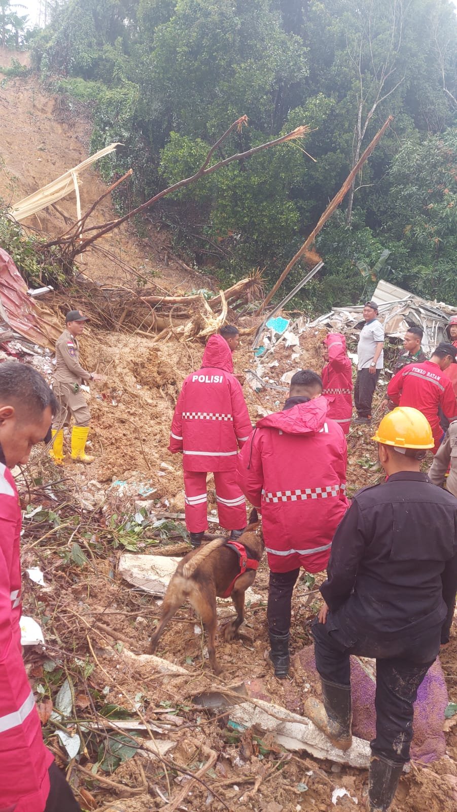 “Untuk mempercepat pencarian korban yang masih tertimbun material longsor, Polda Kepri juga menurunkan unit K9. Anjing pelacak ini diandalkan dalam mendeteksi keberadaan korban di bawah timbunan tanah. Keberadaan unit K9 di lokasi longsor sangat membantu proses evakuasi, terutama di area yang sulit dijangkau oleh alat berat.” tambah Kabidhumas Polda Kepri Kombes. Pol. Zahwani Pandra Arsyad, S.H. M.Si.