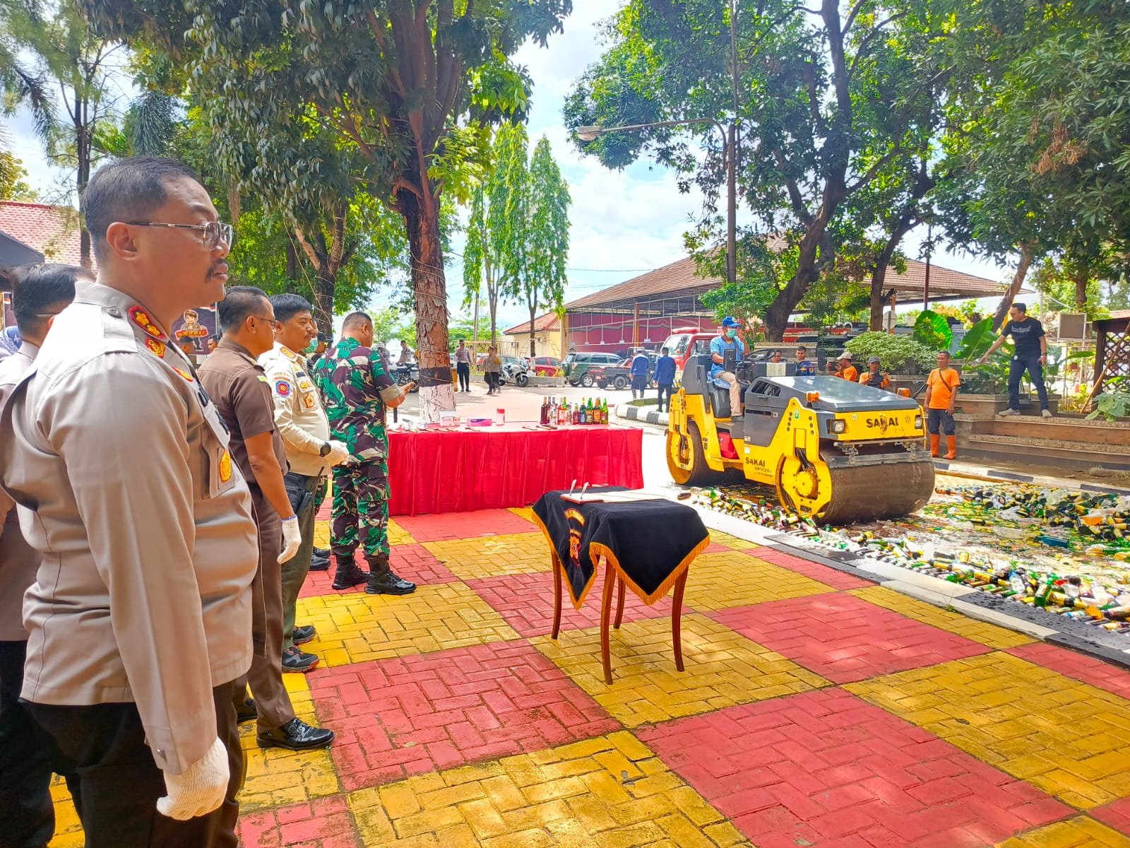 Kapolres mengungkapkan, tak kurang dari 4.272 botol miras dari berbagai merk dan ratusan liter tuak di musnahkan dengan cara dilindas oleh stum atau biasa disebut vibro roller.
